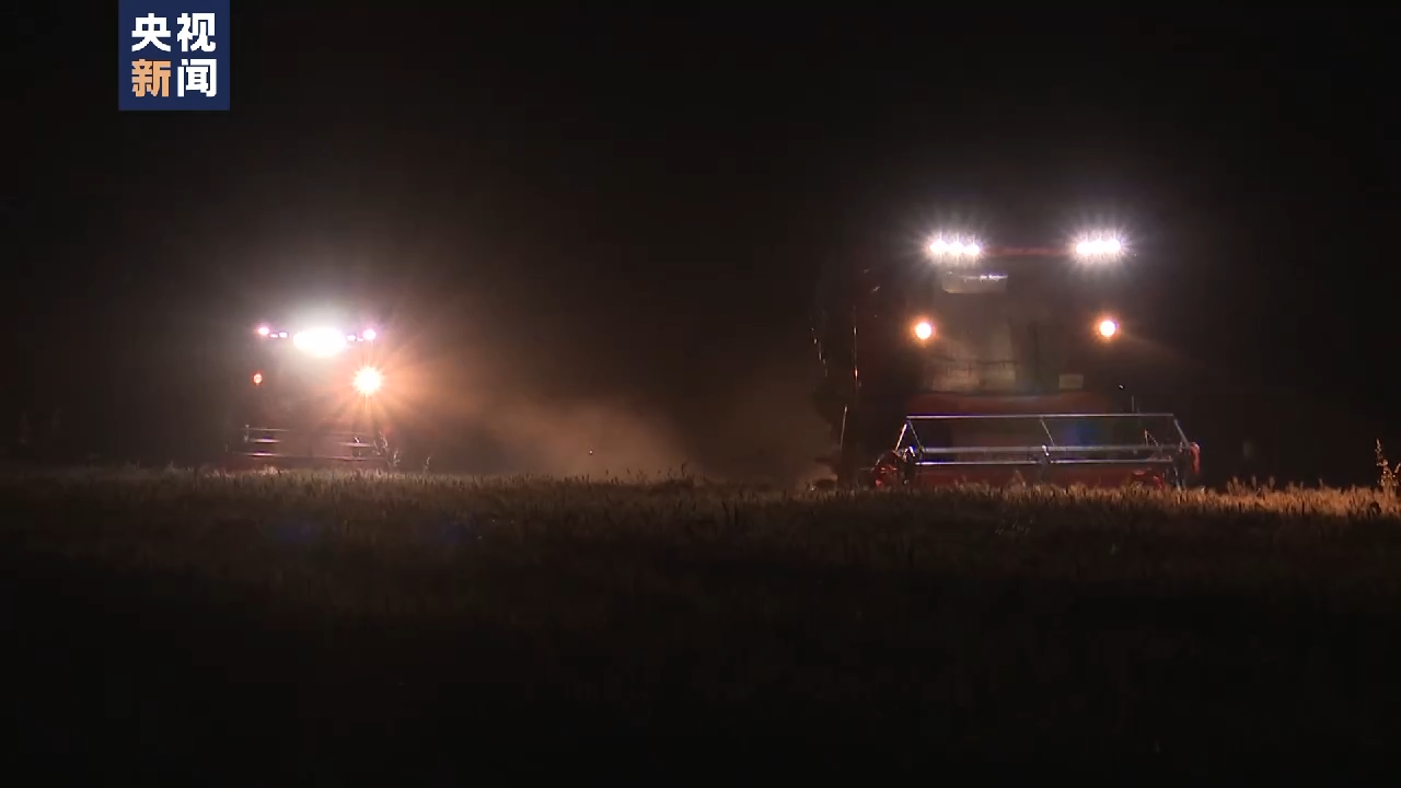 在安徽寿县青峰村,夜幕下的麦田里机器轰鸣,为了抢在下雨前完成收获,农机手们还在持续作业。