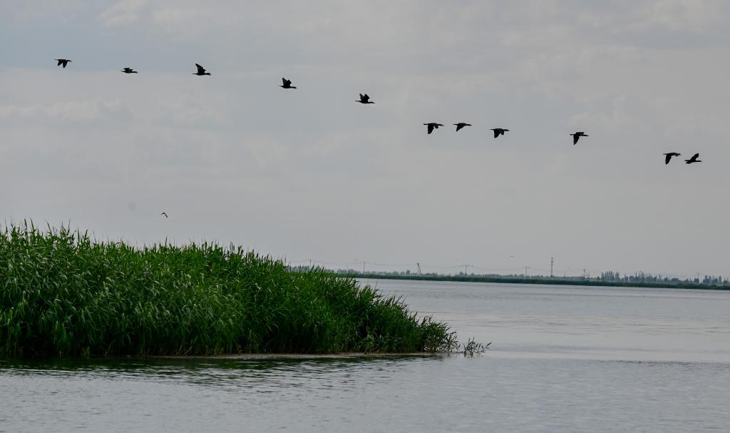 6月5日,一排候鸟在乌梁素海上空飞翔。新华社记者 连振 摄