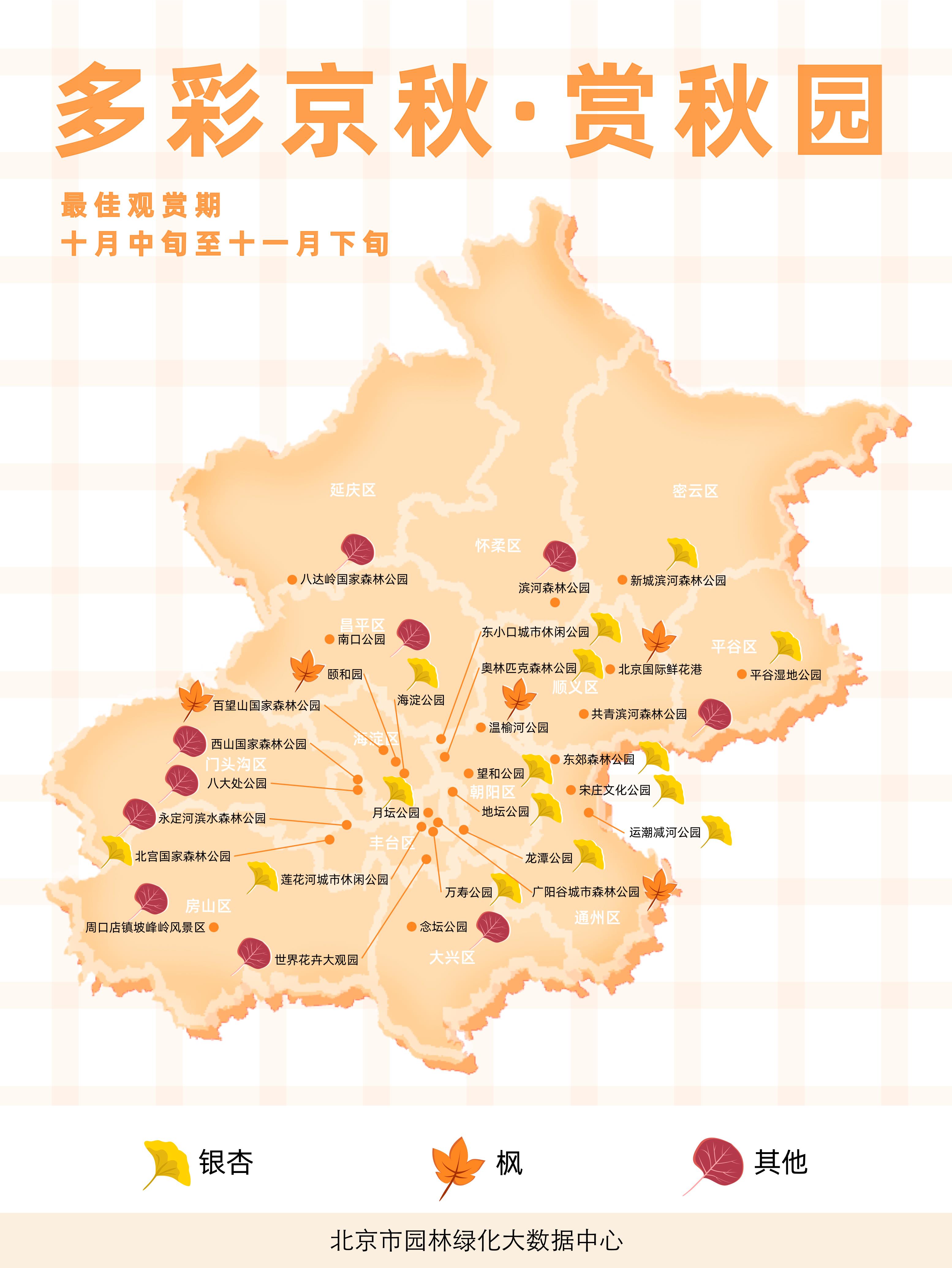 为方便市民金秋出行,感受生态之美,北京围绕彩叶文化、果品文化、观鸟文化等主题,深入挖掘公园、道路、果园及观鸟等多种类型的秋季观赏点位,制作推出了导览图,市民游客访问首都园林绿化官方网站,关注官方微博、微信,即可点击查阅游览资源点位分布情况,了解彩叶品种、特色活动和交通路线等信息,就近选择游览。
