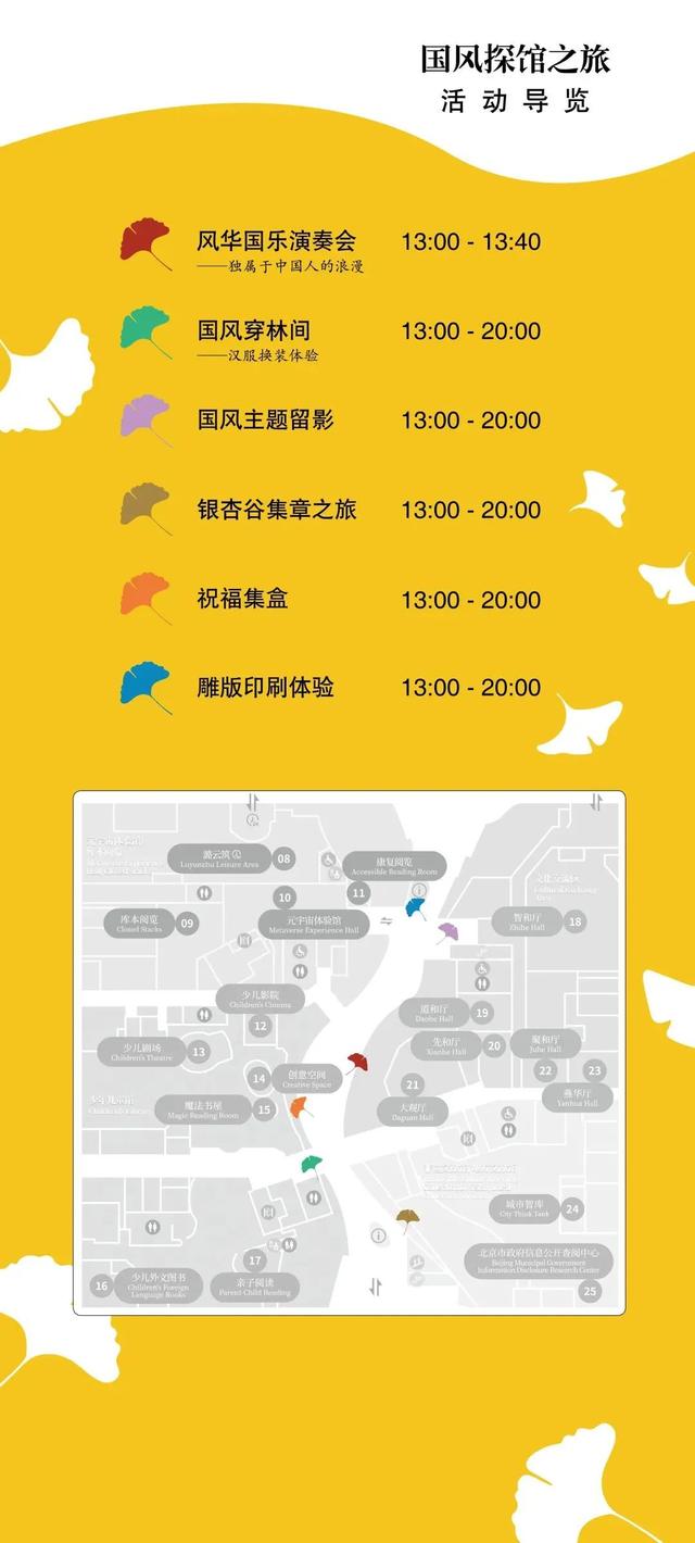 参与者在北京城市图书馆3层阅览区集齐 “北京城市图书馆LOGO”“春楮径”“夏墨径”“秋毫径” “冬石径”共5枚印章后,即可来到“银杏谷集章之旅”点位服务台解锁开馆当日限定隐藏印章。