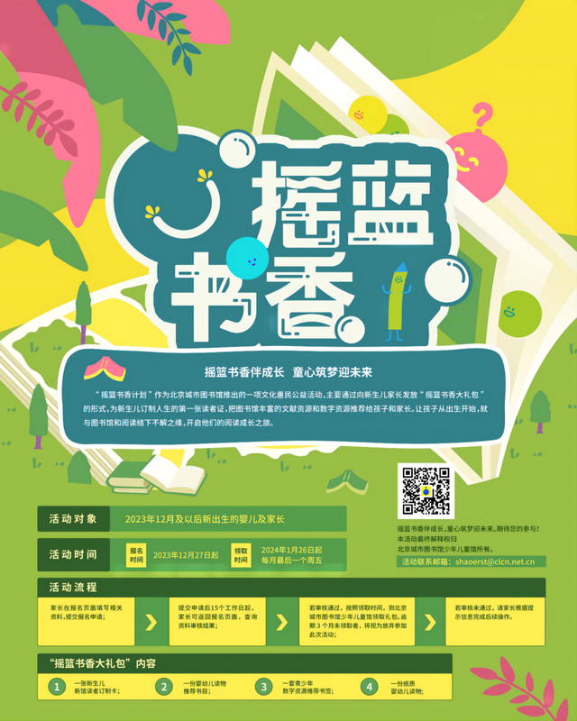 “摇篮书香计划”作为北京城市图书馆推出的一项文化惠民公益活动,主要通过向新生儿家长发放“摇篮书香大礼包”的形式,为新生儿订制人生的第一张读者证,把图书馆丰富的文献资源和数字资源推荐给孩子和家长。让孩子从出生开始,就与图书馆和阅读结下不解之缘,开启他们的阅读成长之旅。