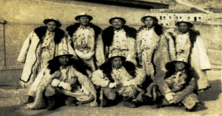1951年在玉门油矿高地住所穿老羊皮工作服合影(前排右一为方华灿) 新华社发
