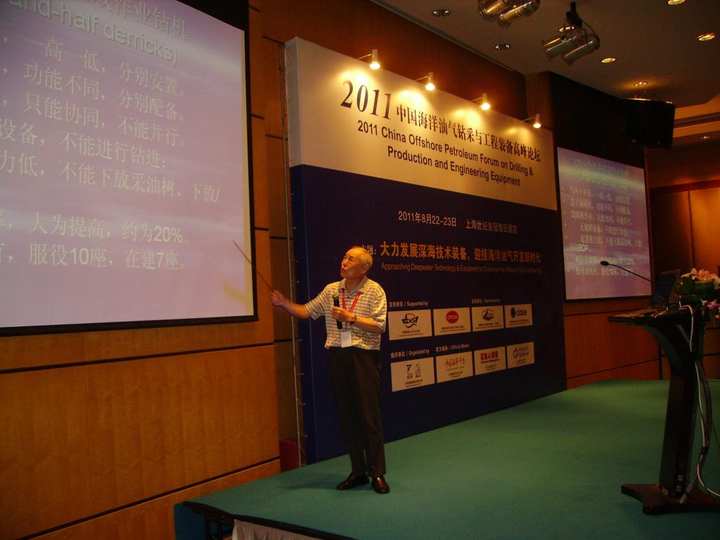 2011年,方华灿在上海参加中国海洋油气钻采与工程装备高峰论坛时作学术报告 新华社发