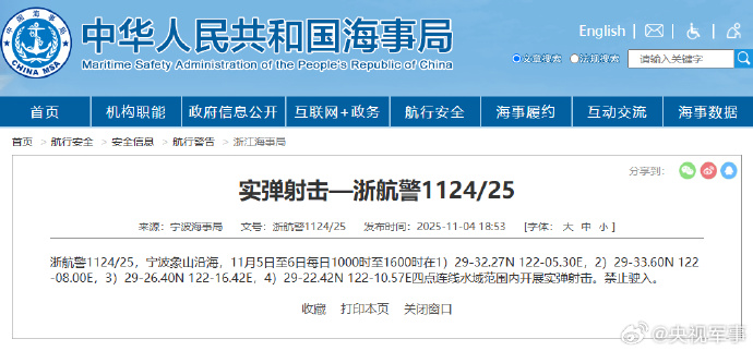 据中国海事局网站消息,宁波海事局发布航行警告,11月5日至6日每日10时至16时,宁波象山沿海开展实弹射击,禁止驶入。