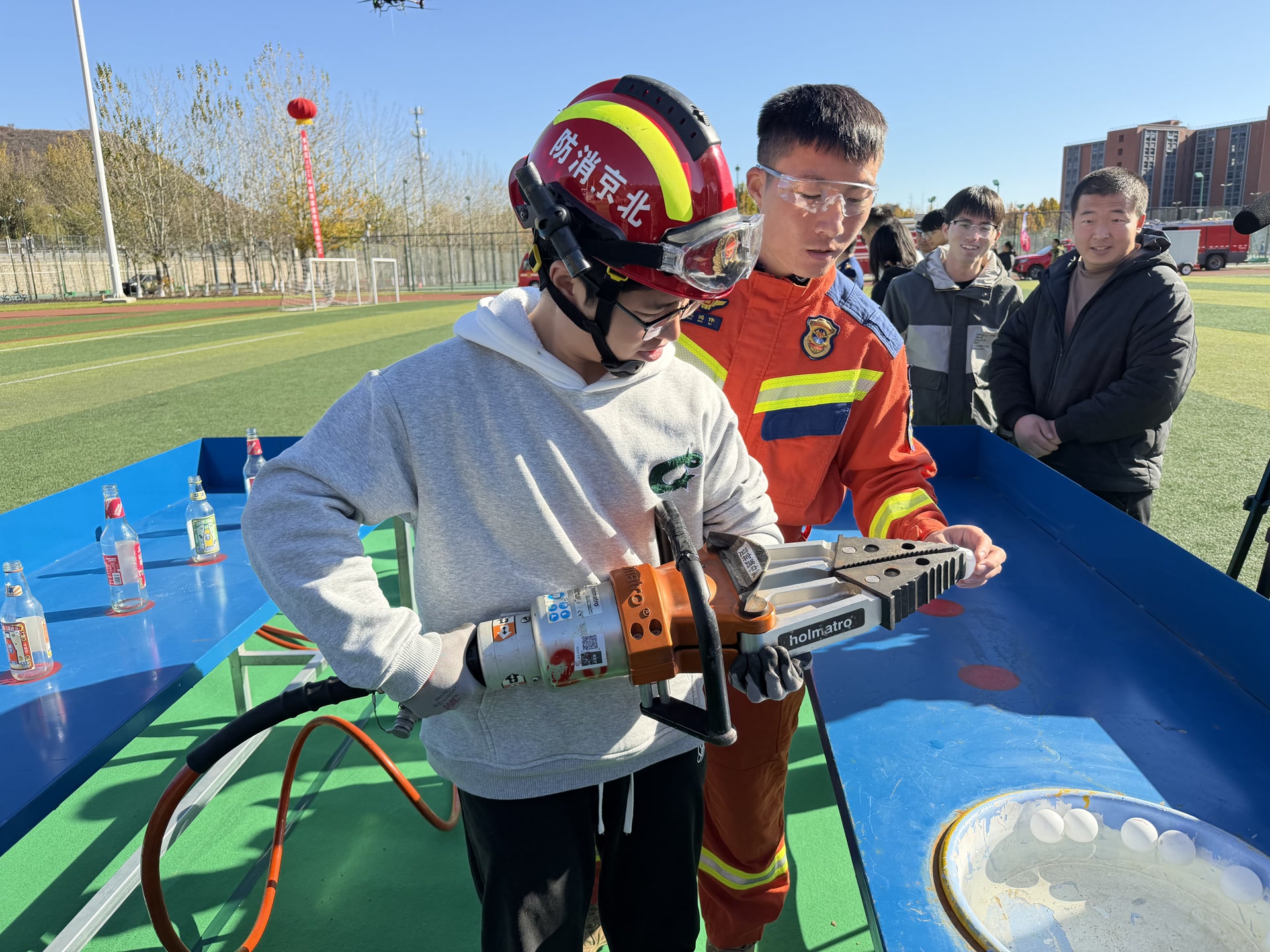 “液压钳有多重,我能试试吗?”一名大学生看完消防员的演示后,决定体验一下液压钳如何夹起一颗乒乓球。消防员一边讲解液压钳的基本操作动作,一边为这名学生做好防护,“这台液压钳将近30斤,破拆救援中,既要求我们操作稳定,也要求力道精准,是个精细活。”