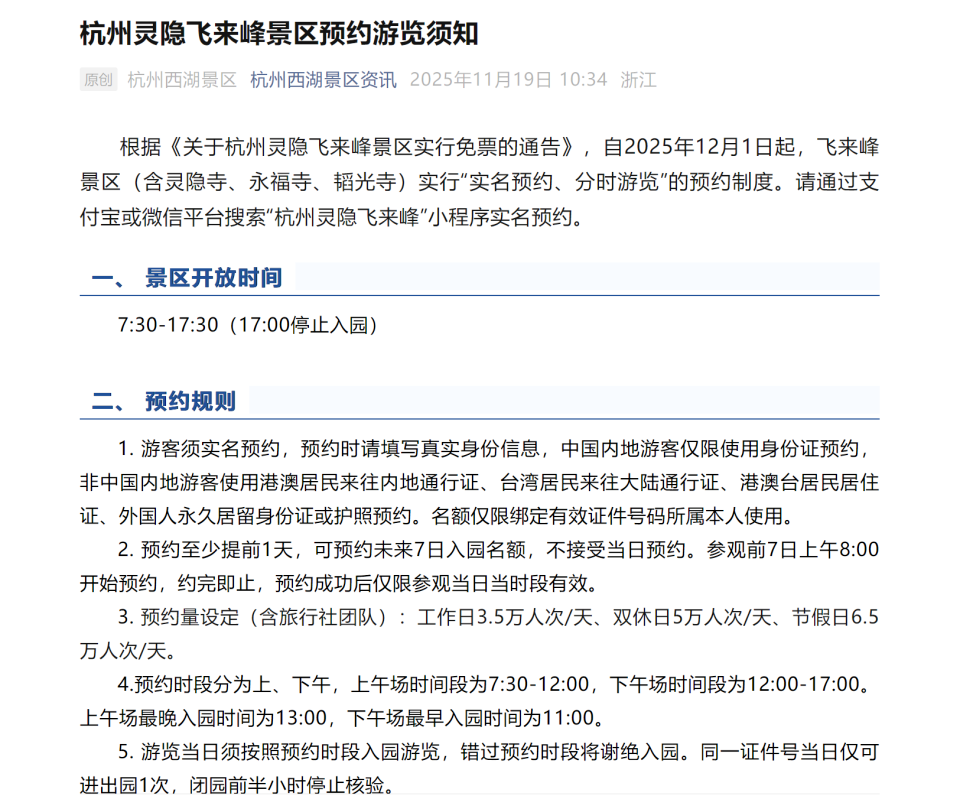 杭州灵隐寺要免门票了。11月19日,杭州西湖风景名胜区发布通告,自2025年12月1日起,灵隐飞来峰景区实行免票政策。为确保游览体验和文物保护,景区将实行线上实名预约制,工作日、双休日、节假日分别设置不同限额,约满即止。