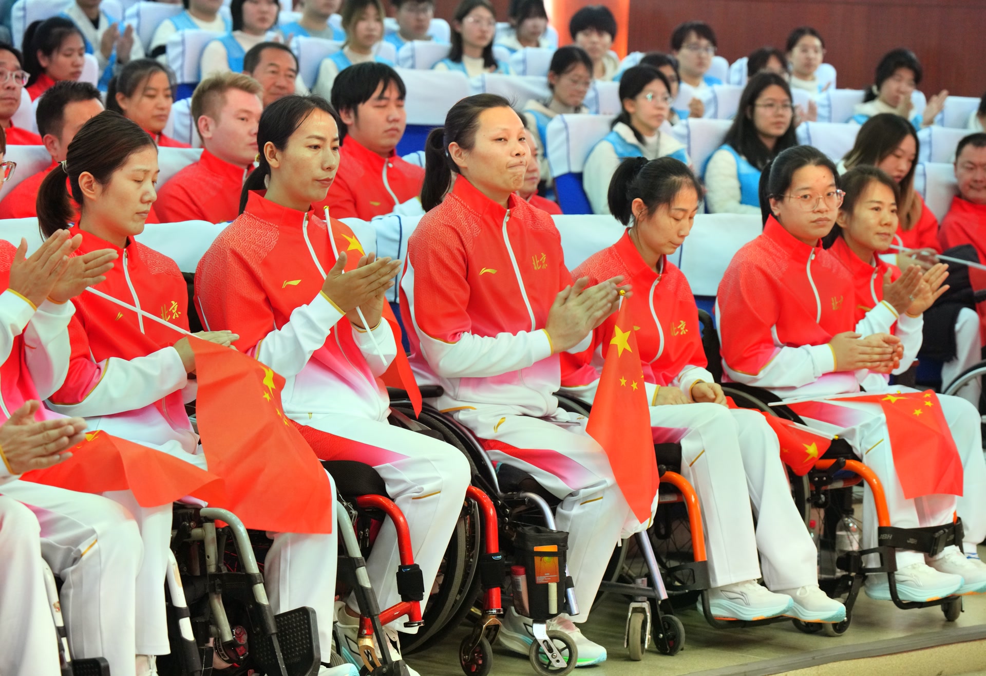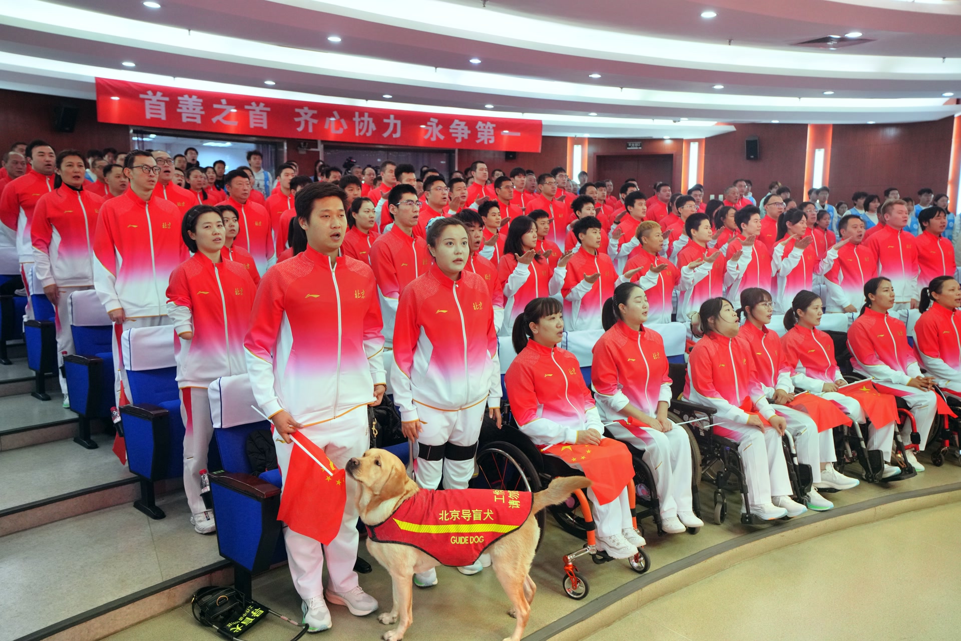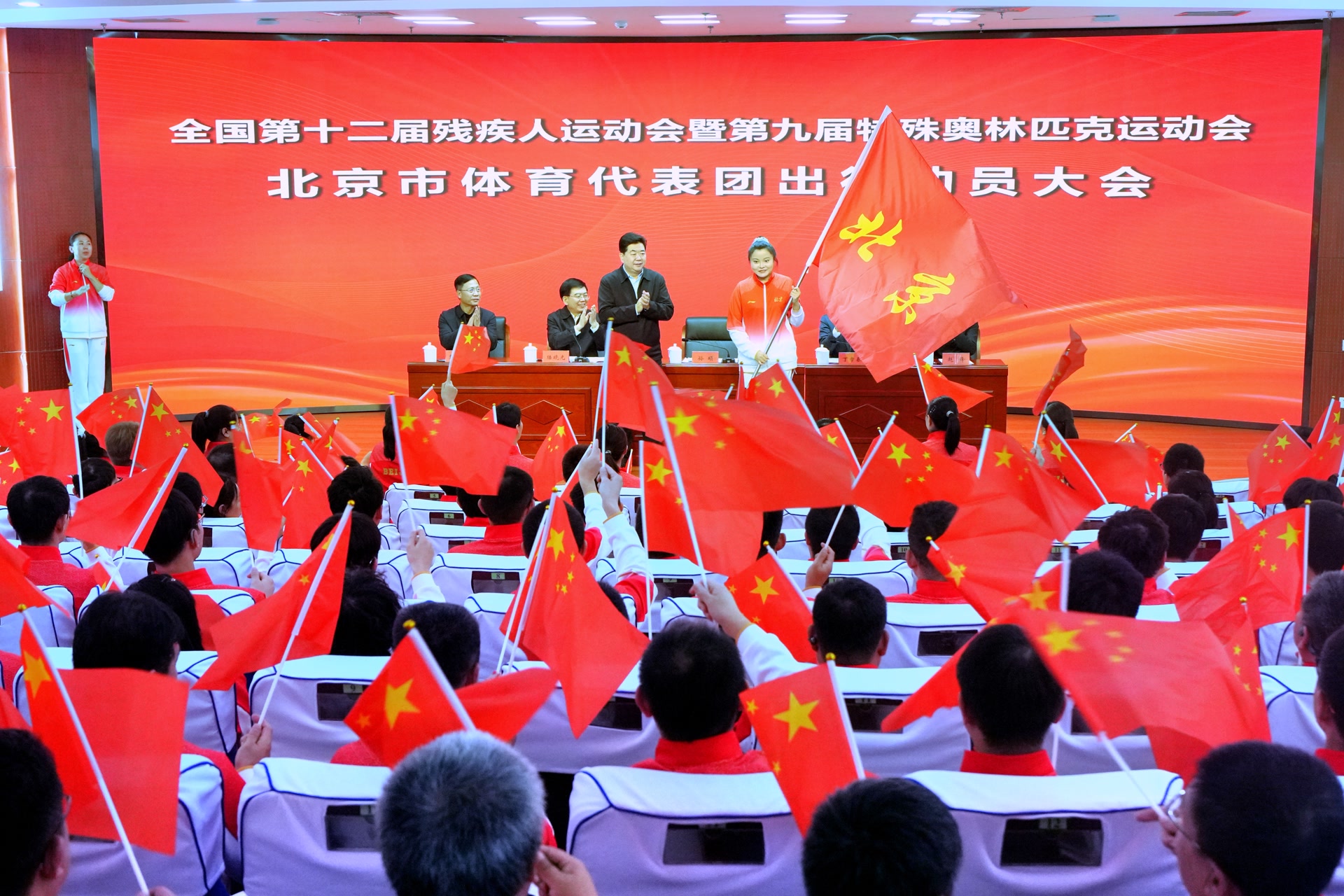 大会现场,开幕式旗手、运动员代表、残奥会冠军茅经典被授予北京代表团团旗,标志着北京市体育代表团正式组建。残奥会冠军、射箭运动员高芳霞,巴黎残奥会硬地滚球冠军张琦的教练员李万露分别发言,他们表示将牢记“首善之首”的责任担当,恪守体育道德,严守赛风赛纪,全力以赴全力争胜,展现新时代首都残疾人新风采。