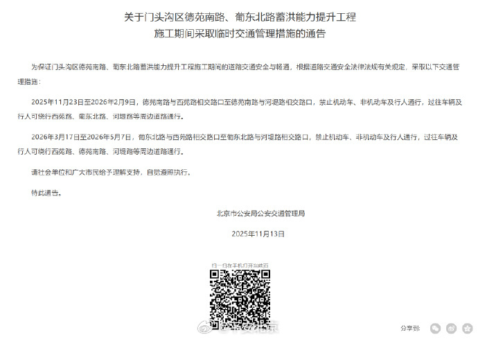 为保证门头沟区德苑南路、葡东北路蓄洪能力提升工程施工期间的道路交通安全与畅通,根据道路交通安全法律法规有关规定,采取以下交通管理措施: