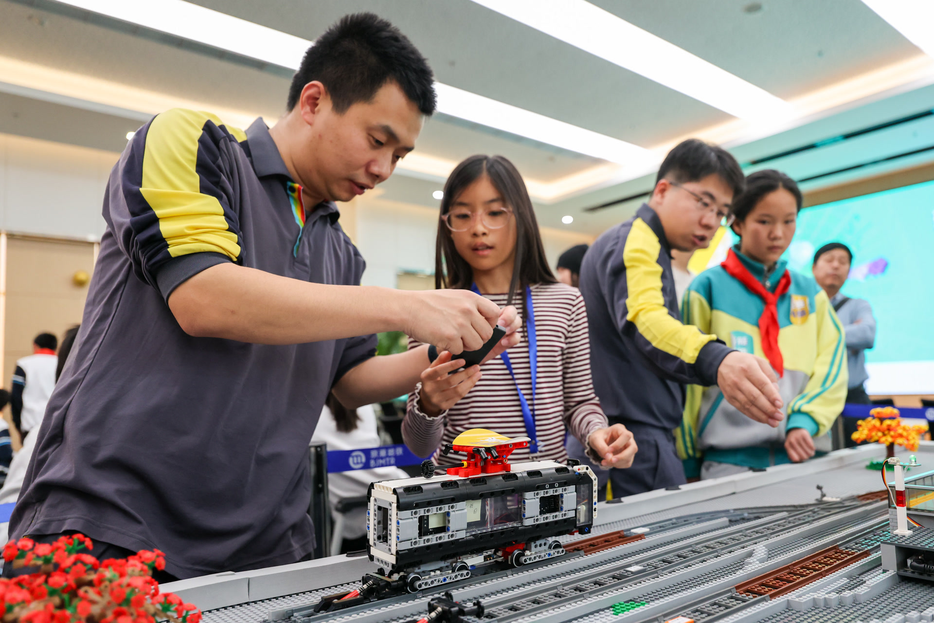 地铁STEAM课程体验环节也同步开展。在京港地铁工程师的专业指导下,香港学生代表深入了解了地铁列车的构造原理,并亲手完成了列车模型的组装。挑战赛的高潮环节,是列车表演赛,由京港两地学生组队协作,共同调试参赛模型。当一辆辆由两地学生共同操控的列车在赛道上行驶时,现场掌声不断,科技成为了连接京港两地青少年的桥梁。