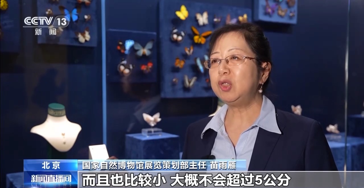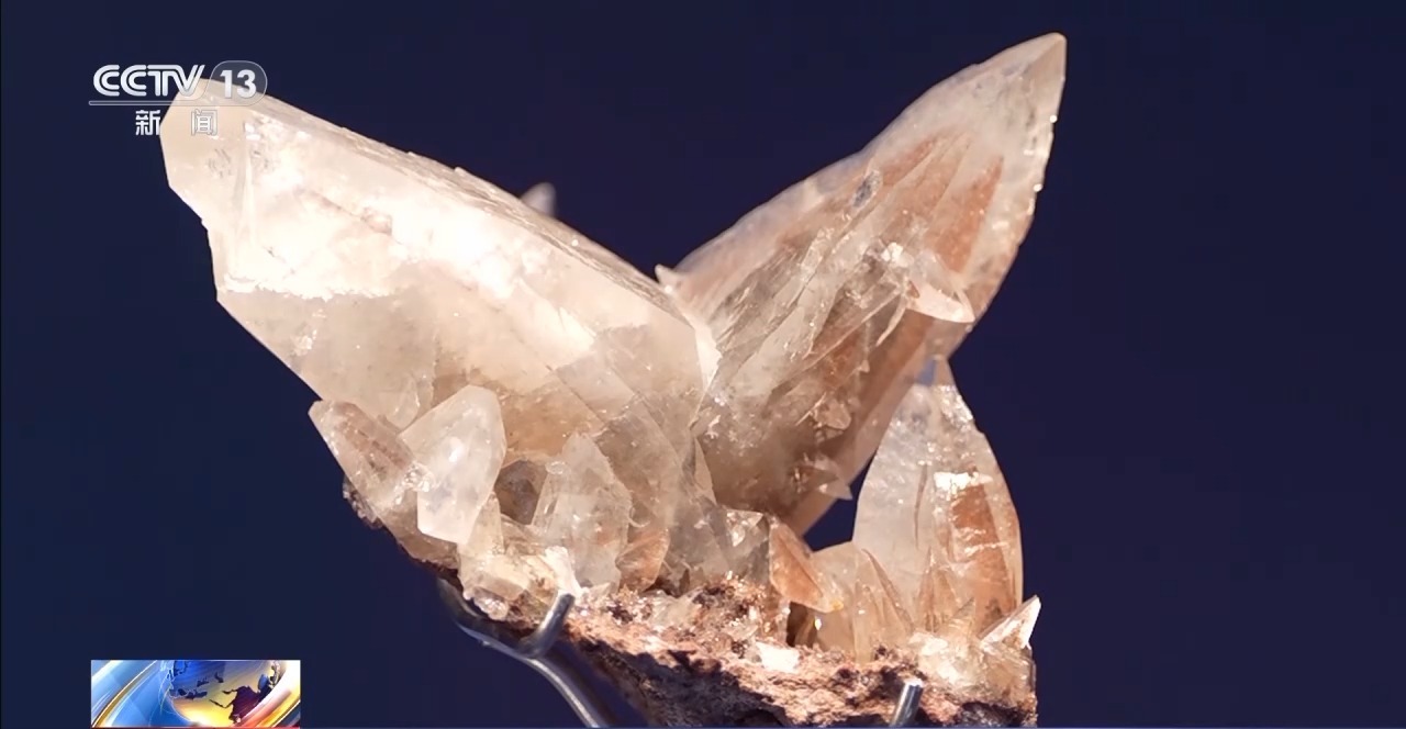 国家自然博物馆展览策划部主任 苗雨雁:目前在世界上已经发现的蝴蝶双晶,也就是在巴西和中国有产出。巴西产出的双晶,一个是颜色是白色,而且比较小,大概不会超过5公分。但是在我们国家湖南产出的双晶,虽然我们看到一簇一簇的不太大,但是晶体比较大,有的能达到10公分,这个是比较罕见的。另一个我们看它的颜色,也是有柔和的粉红色,粉红的像幻影一样。