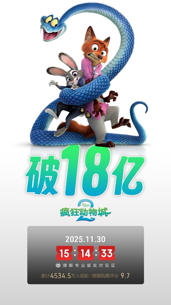 据猫眼专业版数据,电影《疯狂动物城2》上映5天,总票房破18亿。