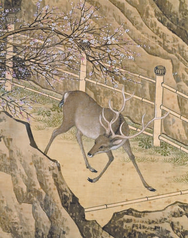 《乾隆宫中行乐图轴(局部)》所绘麋鹿,或为作者金廷标亲往南苑所见。
