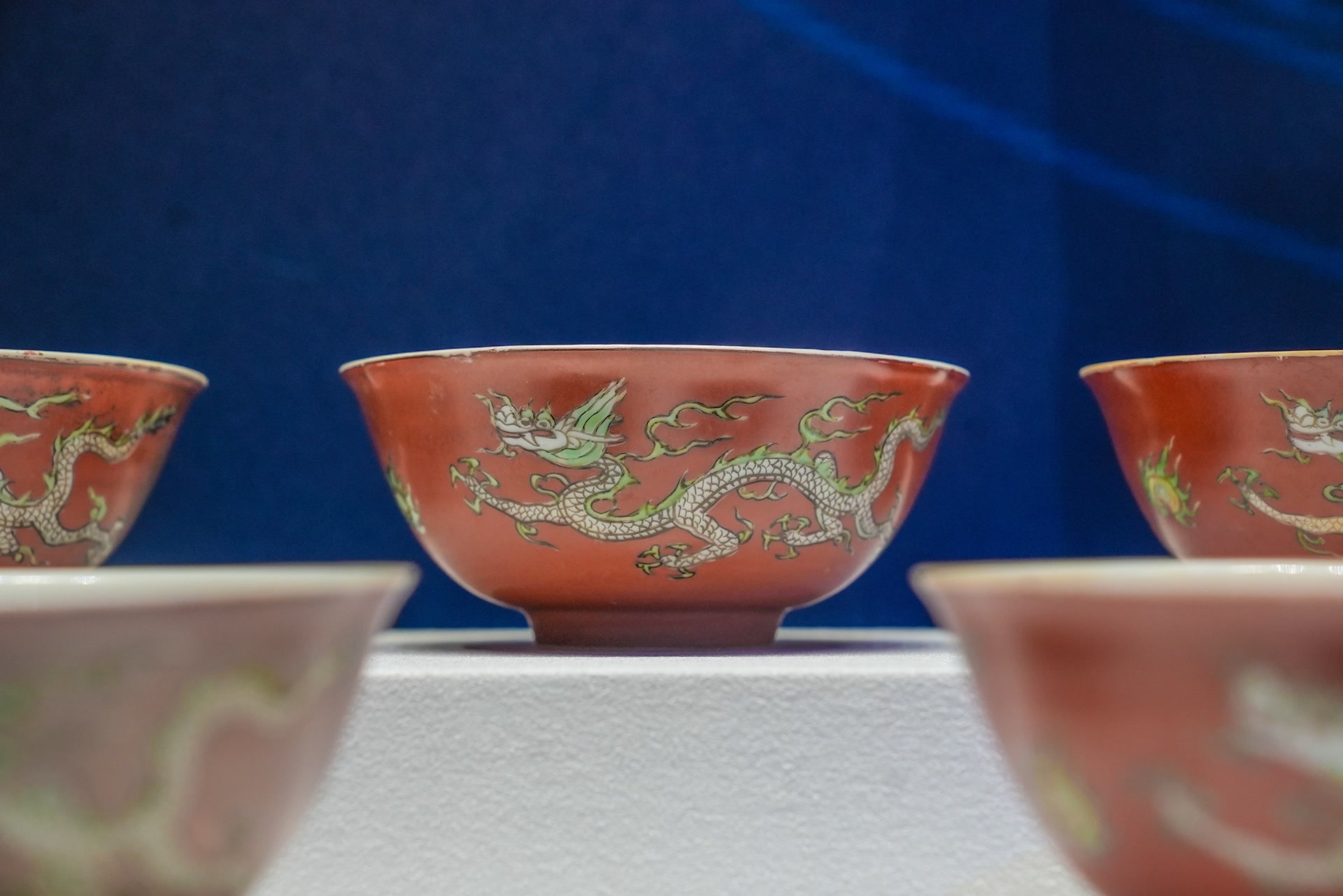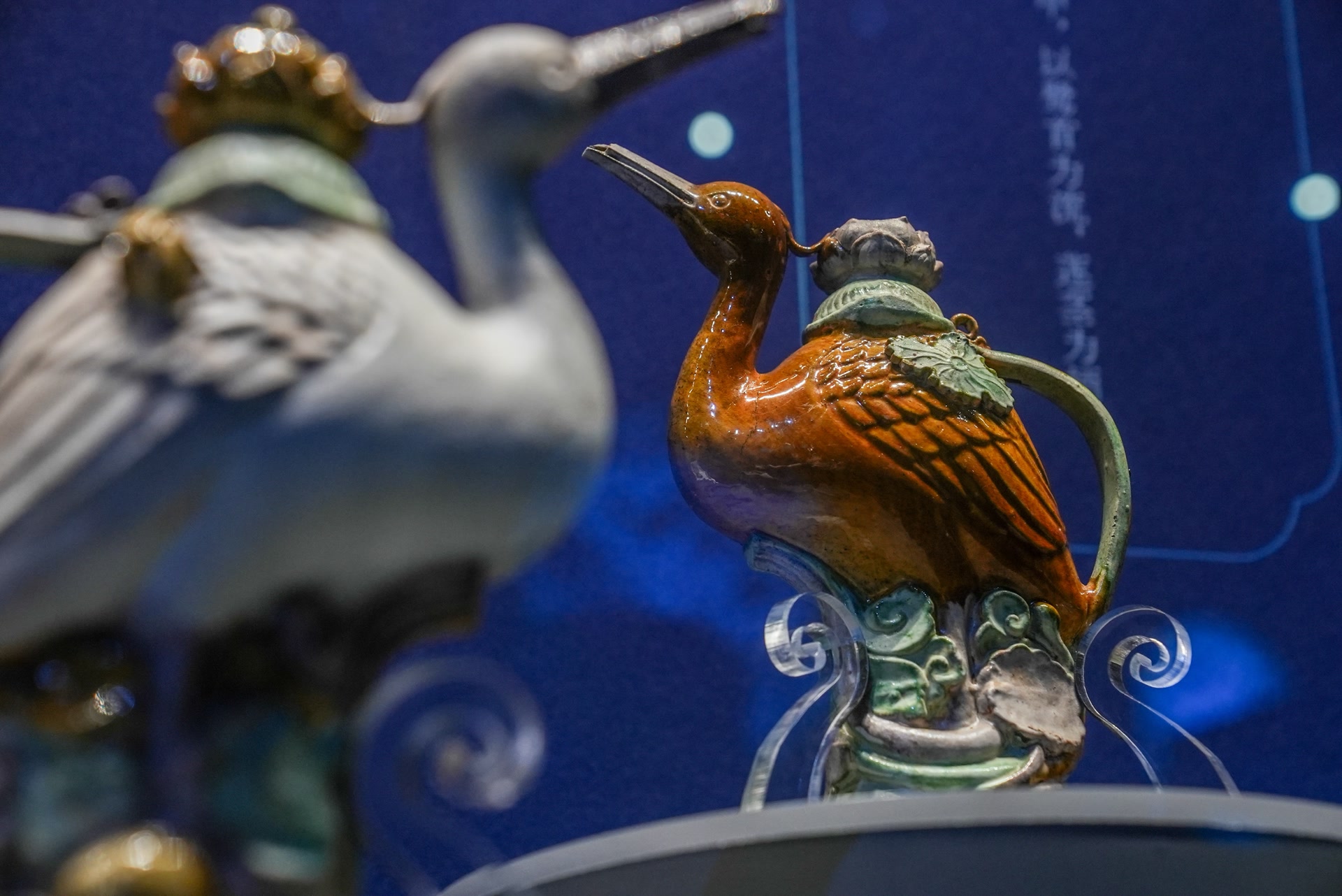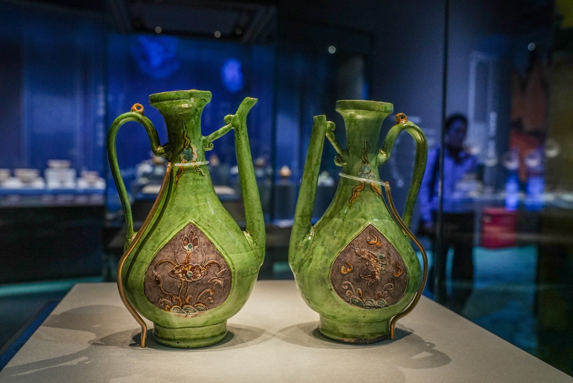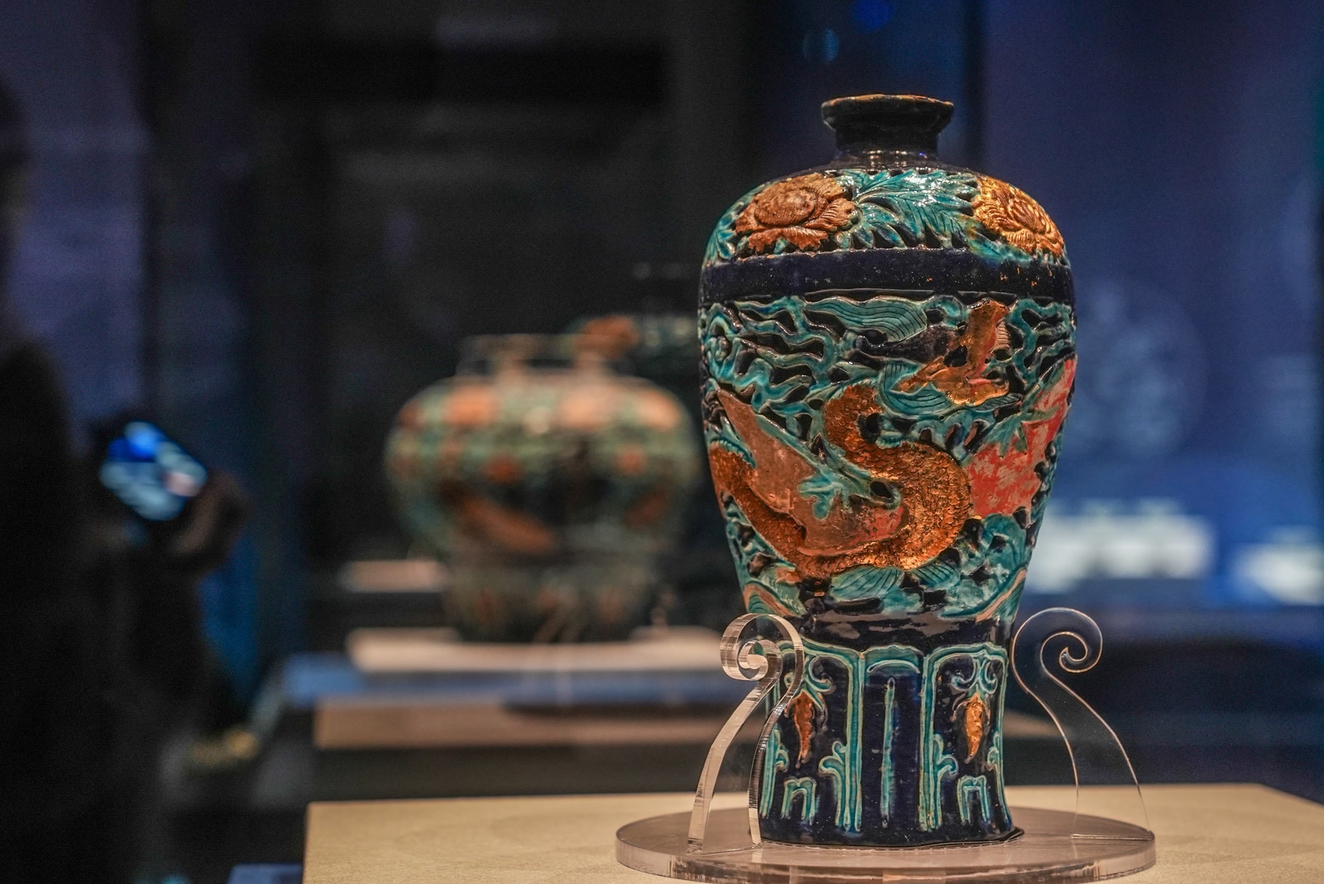 一批珐华彩瓷器被放在展厅最显眼的位置。一水儿的蓝釉、孔雀绿绘满瓶身,但各有各的特色——或镂空、或贴金、或雕画,还有古代匠人精心勾勒的层层浪花纹、应龙纹、牡丹纹……依然保持着约500年前的模样。
