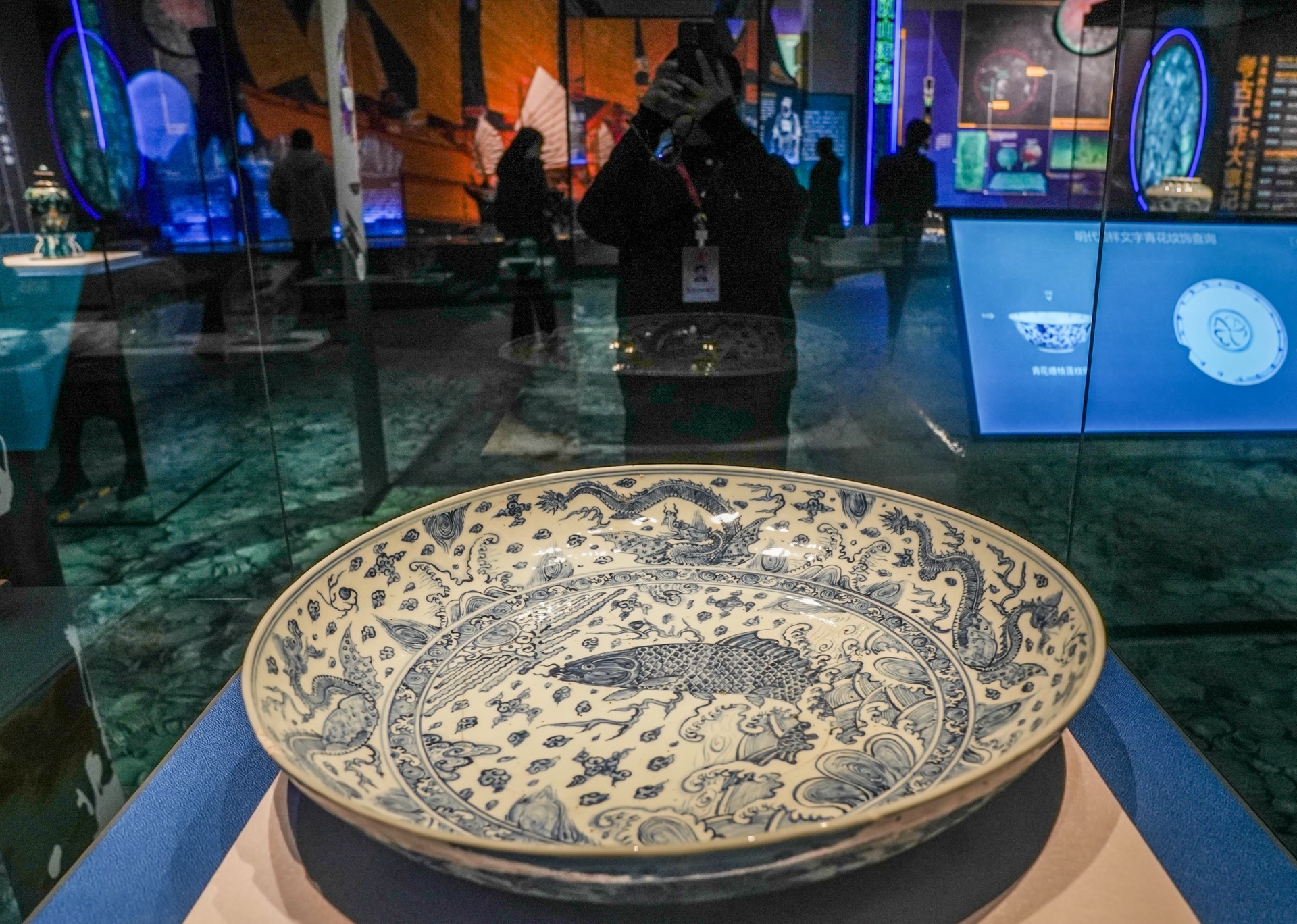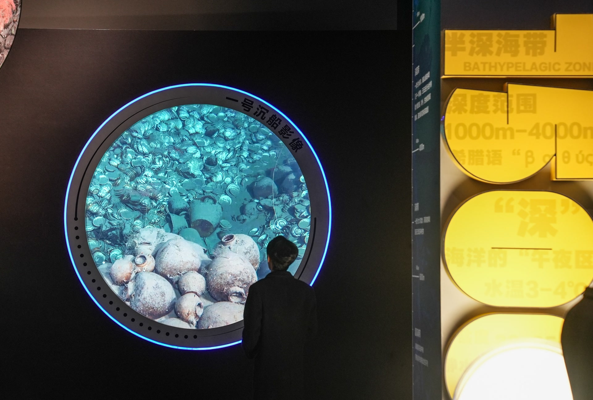 顺着展厅入口处的一束光,观众可以走入深蓝“海底”,探访明代“沉船”,在炫彩斑斓的宝贝间穿梭。近千平方米的展厅里,377组件文物按照“发现沉船”“走进沉船”“揭秘沉船”3个部分,带领观众开启“时光宝盒”,探秘深海考古调查、文物提取与保护修复工作全过程。