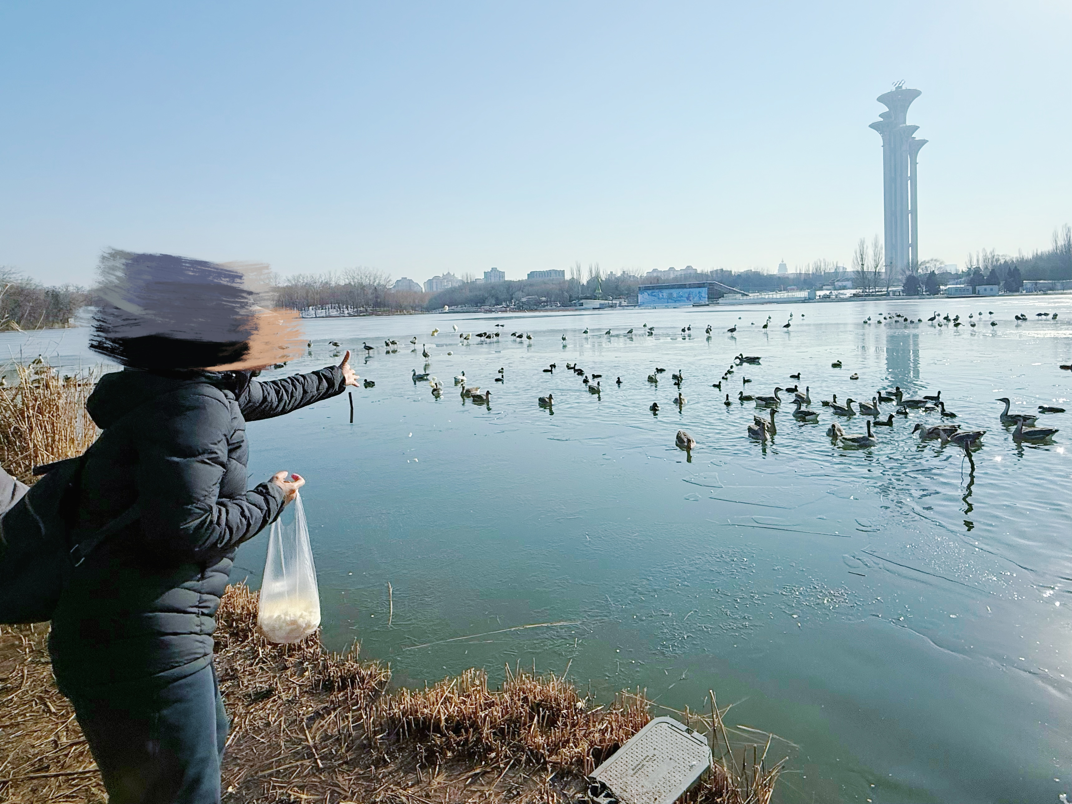 每当群鸟起飞,快门声便此起彼伏。有人举着长焦镜头追随拍摄,也有人从兜里掏出玉米粒,抛向冰面和水中。“这天寒地冻的,草都黄了,不喂它们真怕饿着。”常来公园观鸟的宋阿姨说。