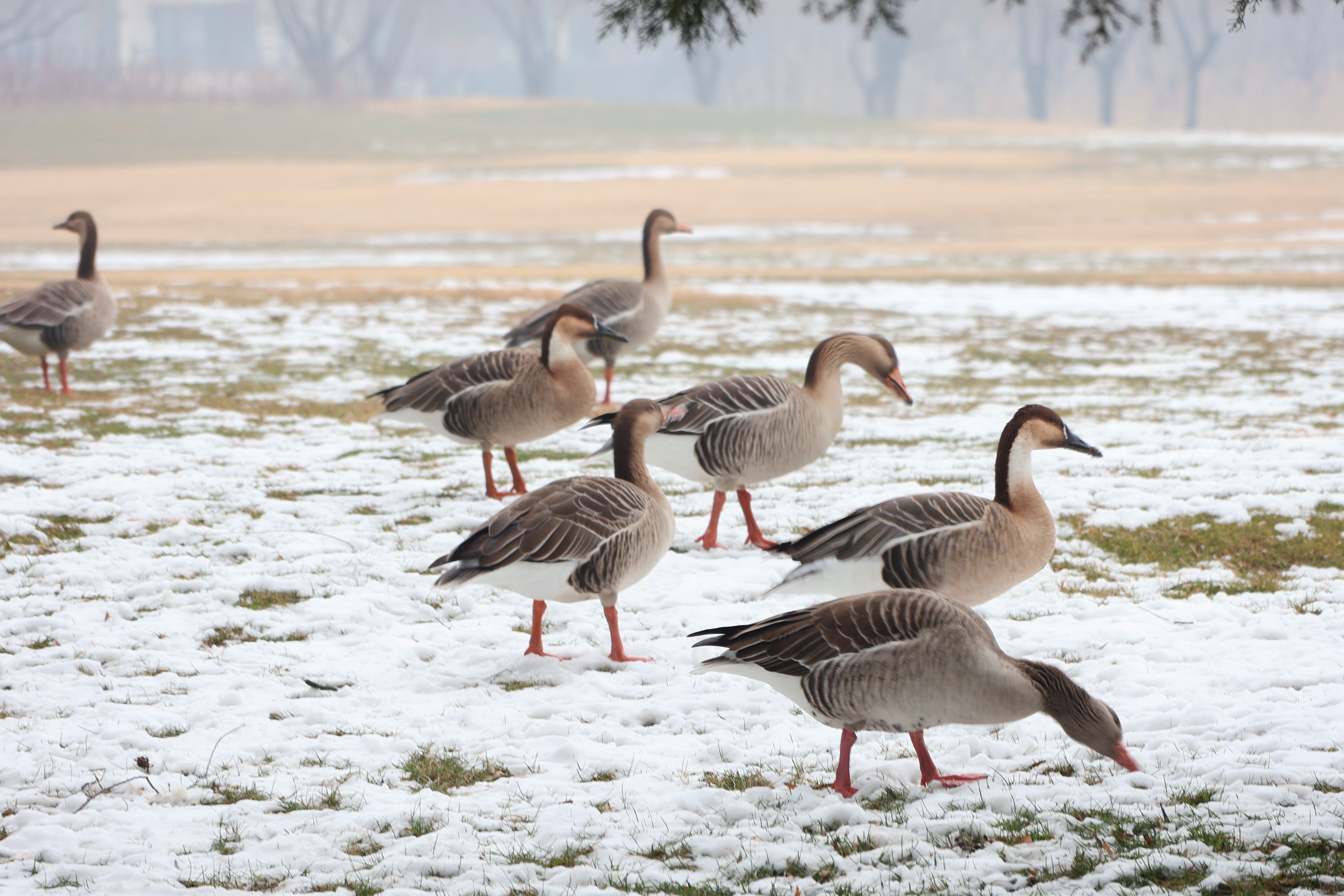 记者来到不远处的紫玉公园。上午十点多,几十只鸿雁和斑头雁正在草坪上觅食。积雪稀疏处裸露出青草,鸟群低头啄食,动作从容,显然十分适应这里的冬日节奏。除了自然觅食,这里每天早晚还有固定投喂。