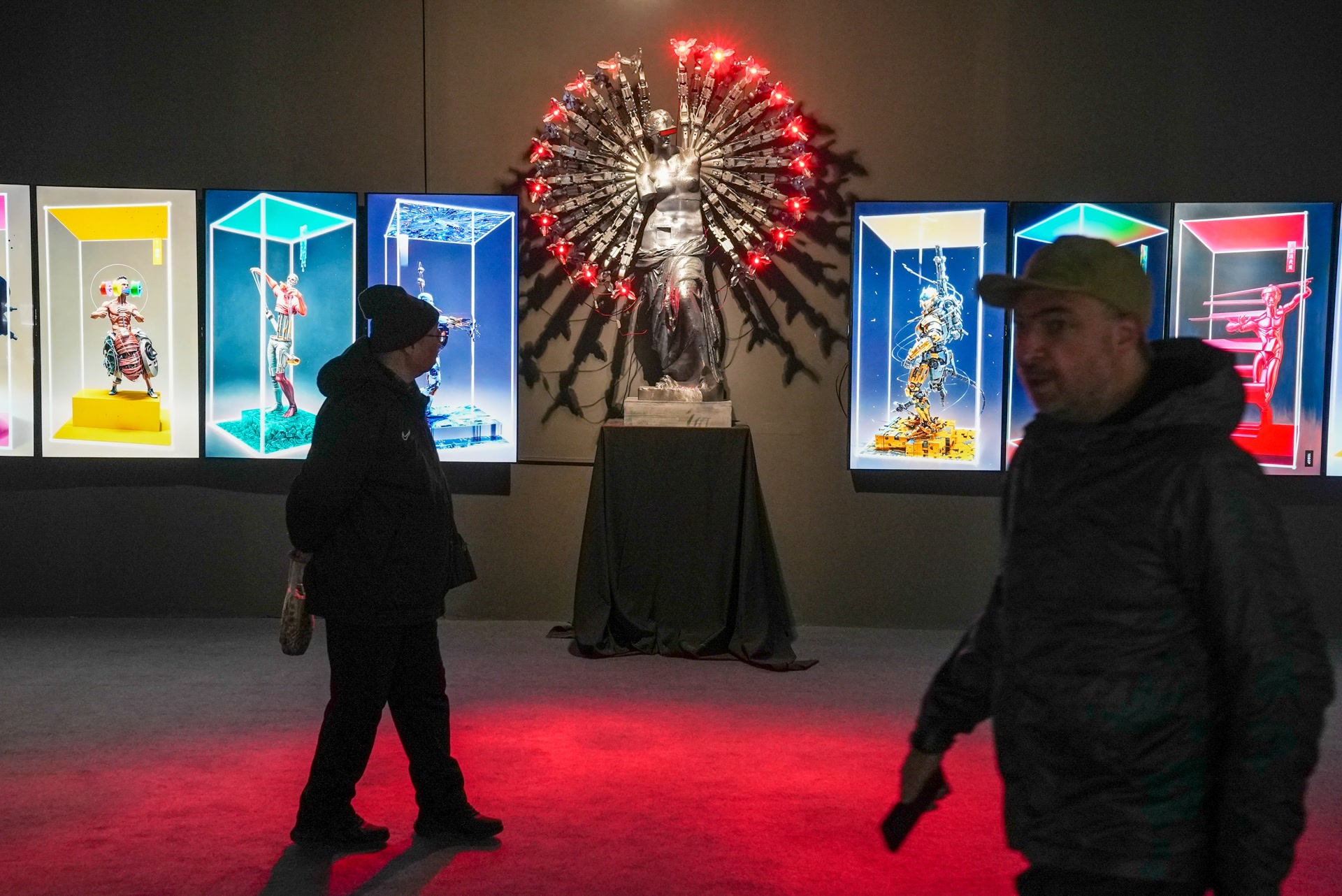 上午11时,穿过一个个艺术展厅,位于4号馆和5号馆的“双年艺市”迎来如织的客流,多数展位都把“持票根享优惠”的活动海报放置在醒目处。COFFEE G咖啡店设置的艺味巡游快闪店,是多数观众的必打卡之地。三款双年展限定特调都有颇具艺术范儿的名字——云上舞白、雪后冰蓝、勃艮酒红。“咖啡香与酒香搭配得很好,头一次在艺术空间品尝特调!”观众赵女士逛展之余细细品味一款特饮。