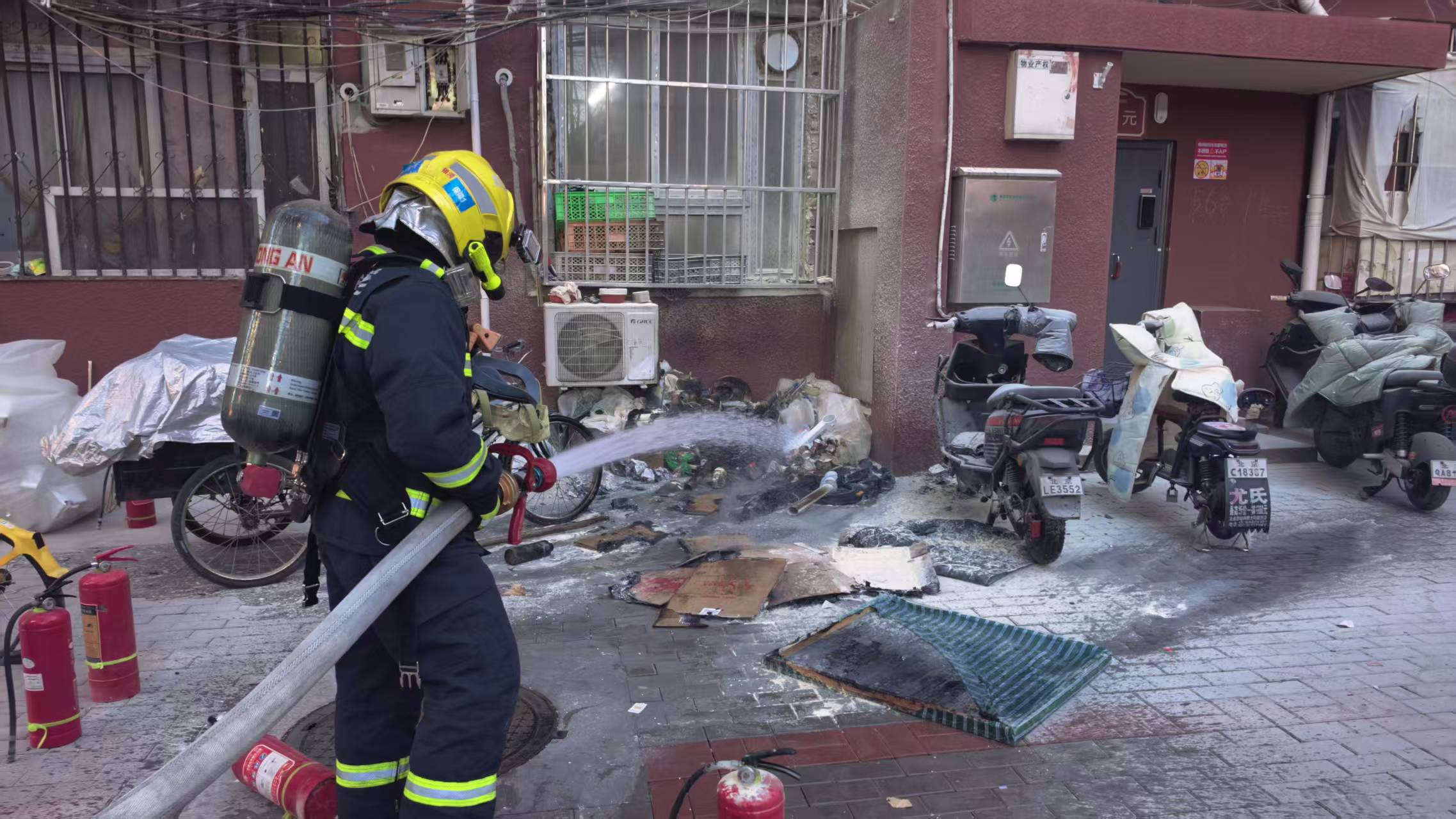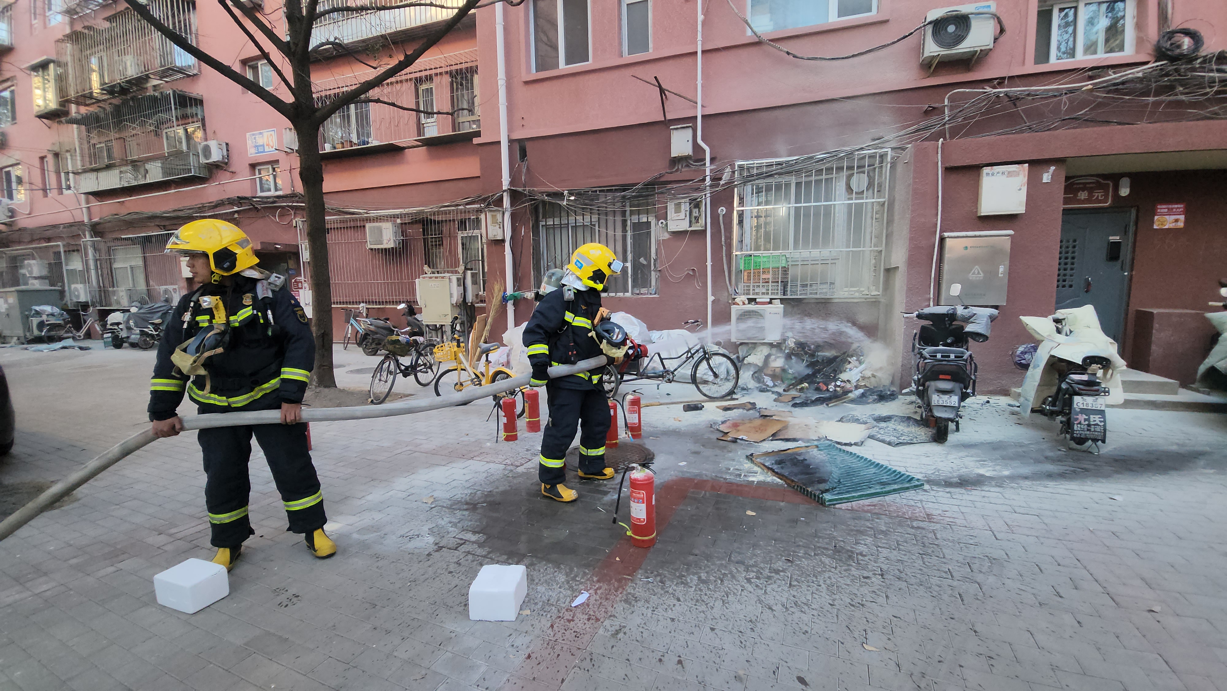 12月31日上午,北京市石景山区鲁谷街道永乐西小区发生一起火灾,起火物为堆放在一居民楼门口的废品杂物。所幸一路过男子发现后,第一时间使用灭火器扑救并高声提醒楼内居民疏散,为后续消防救援争取了时间。