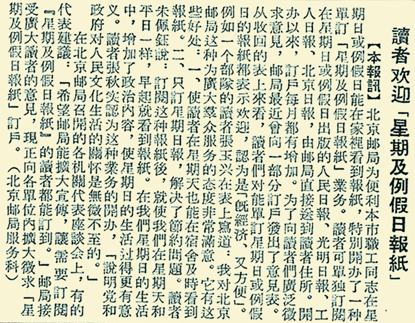此外,邮局推出的单订“星期及例假日报纸”业务,也特别受欢迎。人们可以单独订阅在星期日或例假日出版的《北京日报》等报纸,由邮局直接送到读者住所,这样,星期日或例假日就能在家里看报纸了。这项服务给读者带来了很大便利。读者朱佩钰说,采用这种办法订报后,星期天和平日一样,早上起来就能看到报纸了。读者张玉兴也表示,只订星期日报,既经济又方便。(1955年8月24日《北京日报》2版,《读者欢迎“星期及例假日报纸”》)