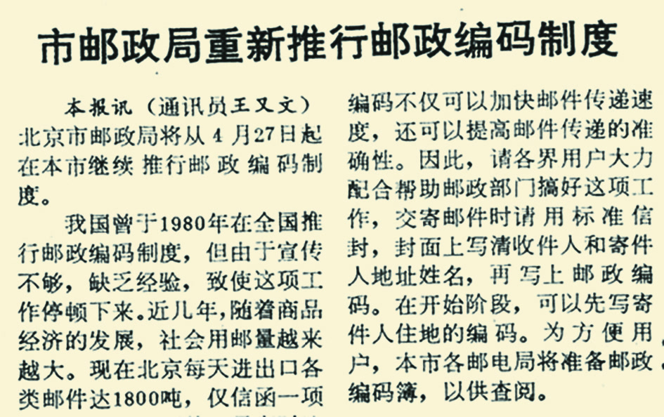 1989年11月1日,北京邮政部门改按地址分拣信函的传统作业方式为按收件人邮政编码分拣,提高了分拣效率。经测验,按地分500封信需5分34秒,而按码分只需4分5秒。过去每逢元旦、春节,北京邮件分拣局总要出现大量邮件积压,1990年元旦、春节,做到了当天邮件当天分净。(1990年1月25日《北京日报》1版,《元旦春节旺季当天邮件当天分净》)