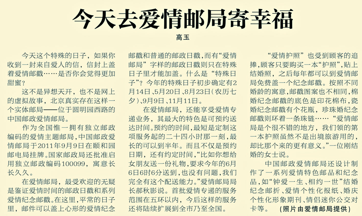 2011年9月9日,作为全国唯一拥有独立邮政编码的爱情主题邮局——中国邮政爱情邮局在颐和园挂牌。国家邮政局批准启用独立邮政编码100099,寓意长长久久。平常,人们在这里可以盖心形的爱情纪念邮戳和普通的邮政日戳;遇农历七夕等特殊日子,还可以盖有“爱情邮局”字样的邮政日戳。除此之外,这家主题邮局还提供一系列爱情特色邮品和纪念品。(2012年2月14日《北京日报》12版,《今天去爱情邮局寄幸福》)
