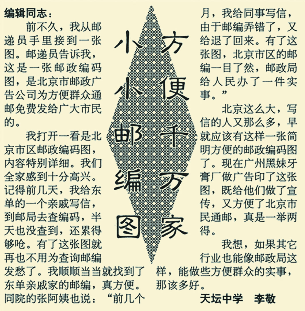 为了让邮政编码更加普及,邮政部门想了很多办法。1992年,邮政部门制作了“北京市区邮政编码图”免费发放给市民。一位市民收到邮政编码图后说:“前几个月,我给同事写信,由于邮编弄错了,又给退了回来。有了这张图,北京市区的邮编一目了然。”(1992年10月16日《北京日报》8版,《小小邮编图方便千万家》)很多工作人员因熟记邮政编码成了“活电脑”。像北京永安路邮局营业员李惠荣,就熟记了1000多个地区的邮政编码。一次,有位市民急着往外地发70多封信,可记不清邮编,李惠荣只用10分钟就处理完毕,这位市民叹服:“要是我翻簿子,没两个小时肯定查不完。”(1993年2月26日《北京日报》2版,《李惠荣熟记邮编方便用户》)
