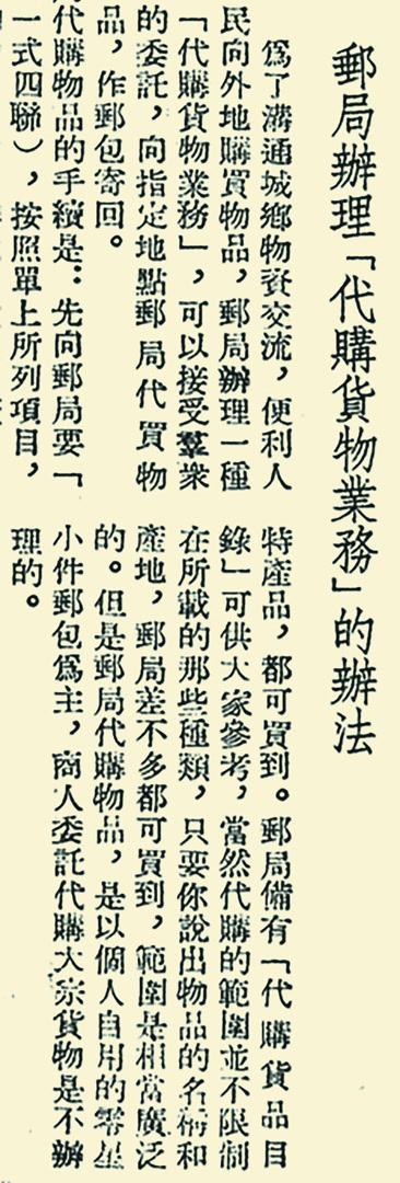 那个年代,为了方便人们从外地购买物品,邮局开通了“代购货物业务”,也就是接受群众委托,从指定地点邮局代买物品,然后作邮包寄回。因为邮政机构遍布全国,所以人们想买西北的毛线、上海的文具、各地土特产品等,大都可以买到。邮局备有“代购货品目录”,即便超出目录范围,只要有物品名称和产地,购买需求也差不多能够满足。(1952年12月28日《北京日报》2版,《邮局办理“代购货物业务”的办法》)