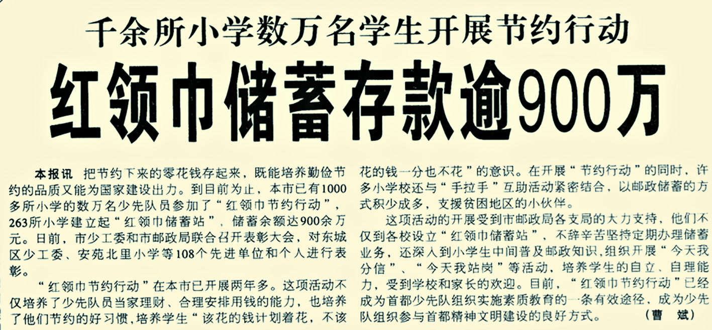 那时候,一场由小学生参与的邮政储蓄活动引发了不小的轰动。1995年底,北京团市委、少先队北京市工作委员会和北京市邮政管理局共同发起了“红领巾节约行动”,号召孩子们把零花钱、压岁钱存到家庭、学校附近的邮政储蓄点,办理活期储蓄,支援国家建设。(1996年2月20日《北京日报》2版,《孩子的压岁钱可派上用场》)全市多所小学的学生热烈响应。当时,各邮政储蓄点都开设了专台,指派专人办理少年储蓄;很多邮政储蓄点还提供上门服务,帮助有条件的学校建立“红领巾储蓄站”。(1996年3月26日《北京日报》2版,《邮政储蓄红领巾行动响应热烈》)截至1998年2月,全市有1000多所小学的数万名少先队员参加了“红领巾节约行动”,263所小学建立起“红领巾储蓄站”,储蓄余额达900余万元。(1998年2月5日《北京日报》6版,《红领巾储蓄存款逾900万》)