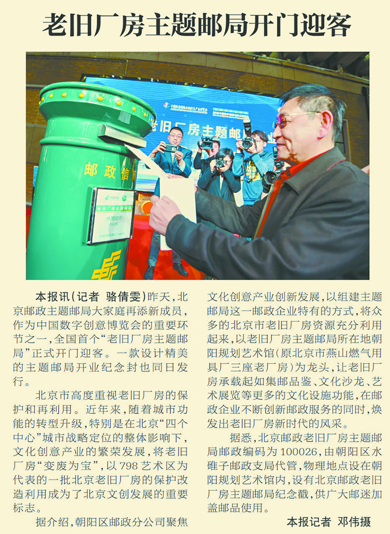 2018年,全国首个“老旧厂房主题邮局”开门迎客。这家主题邮局位于朝阳规划艺术馆,也就是原北京市燕山燃气用具厂的老厂房,设有北京邮政老旧厂房主题邮局纪念戳,还举办集邮品鉴、文化沙龙、艺术展览等活动,昔日的老旧厂房因此焕发出新时代风采。(2018年10月24日《北京日报》8版,《老旧厂房主题邮局开门迎客》)