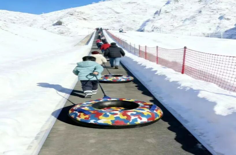 【魔毯雪道】雪场的超长魔毯是玩雪的“黄金搭档”,拉着雪圈就能轻松上坡,不用费力攀爬,老人小孩都能轻松驾驭。