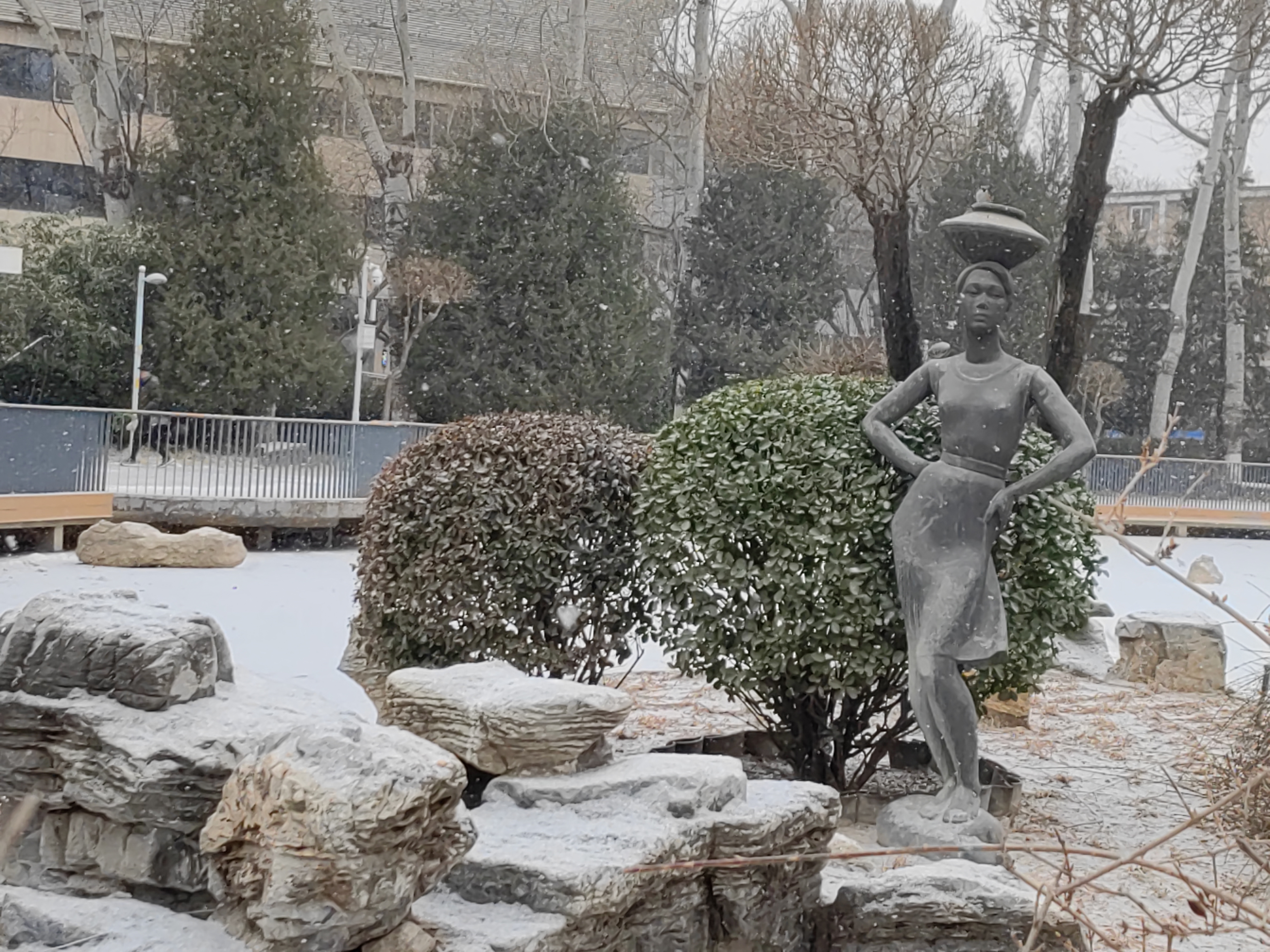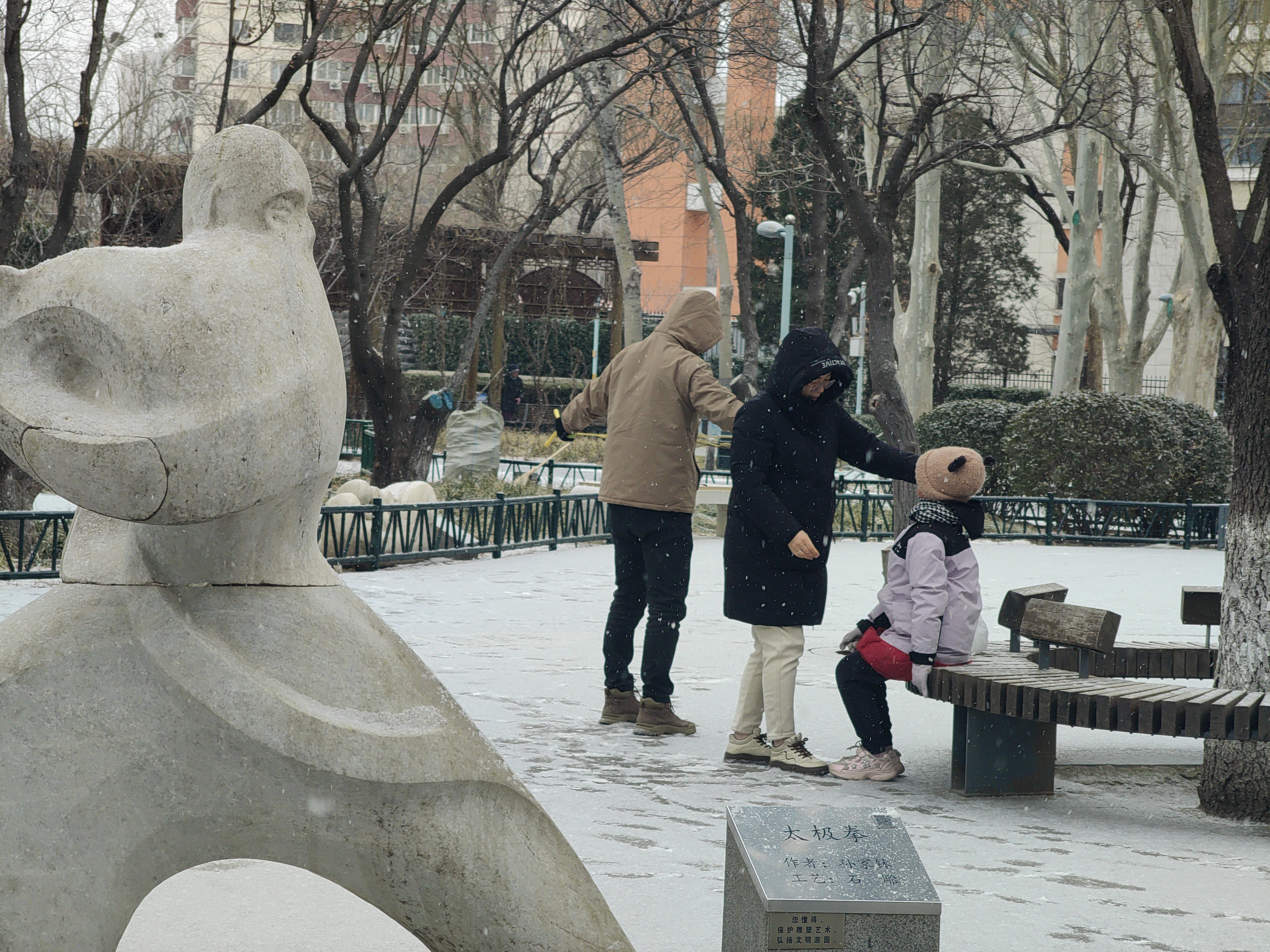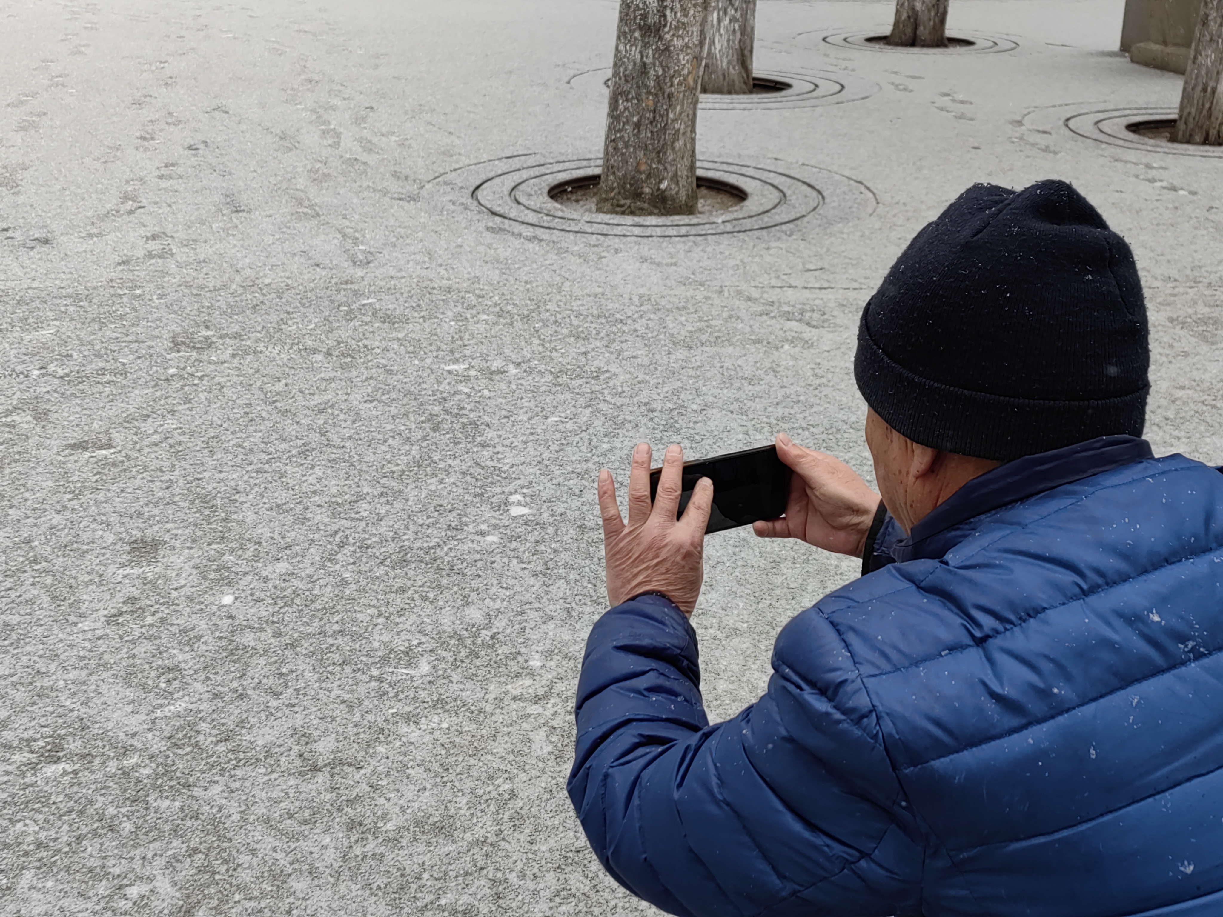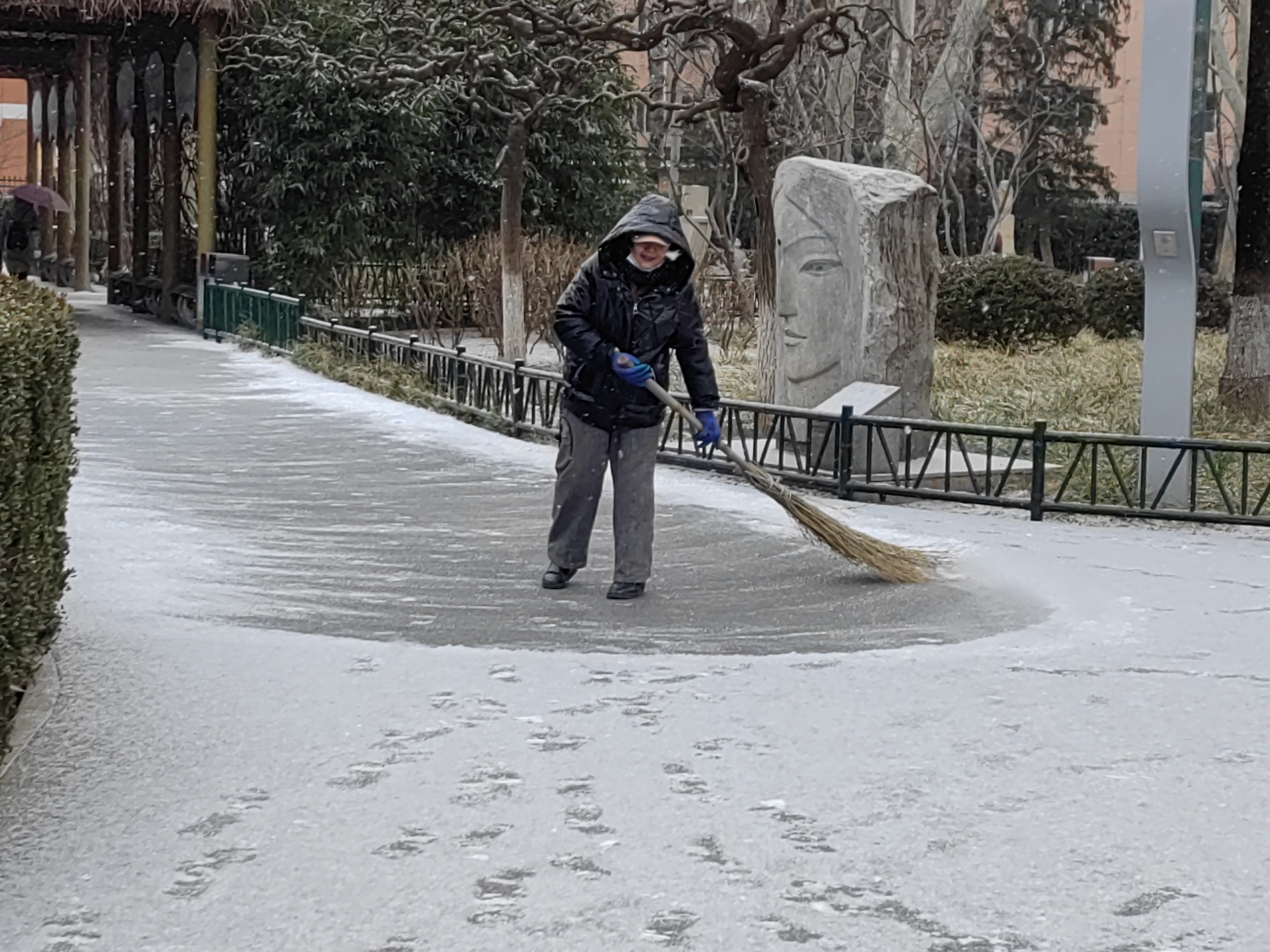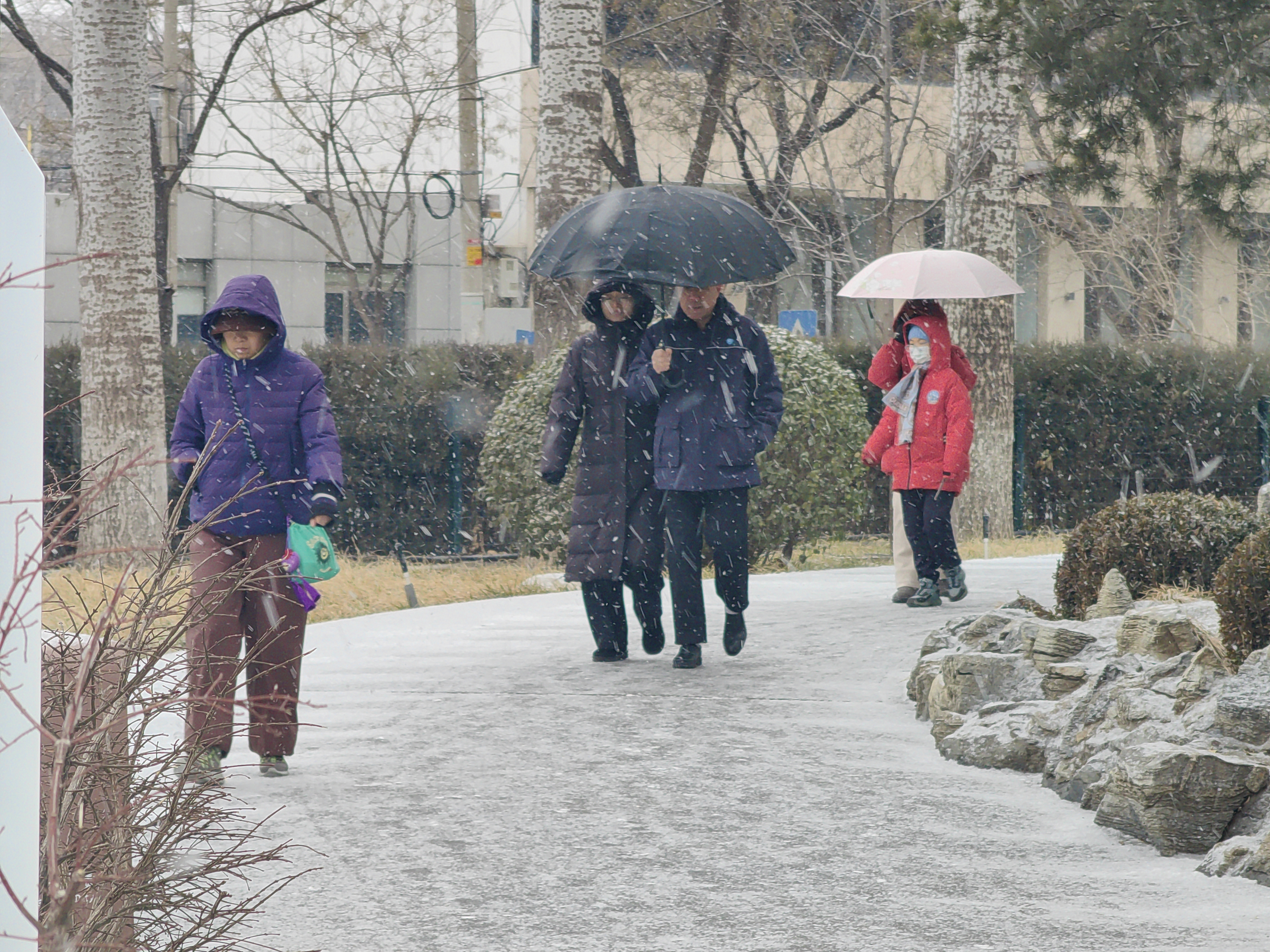 1月17日清晨,石景山区开始降雪,出行的市民撑起雨伞冒雪前行,不少单位的值班人员拿起扫把清扫门前积雪。公园里,居民不畏严寒欣赏雪景。