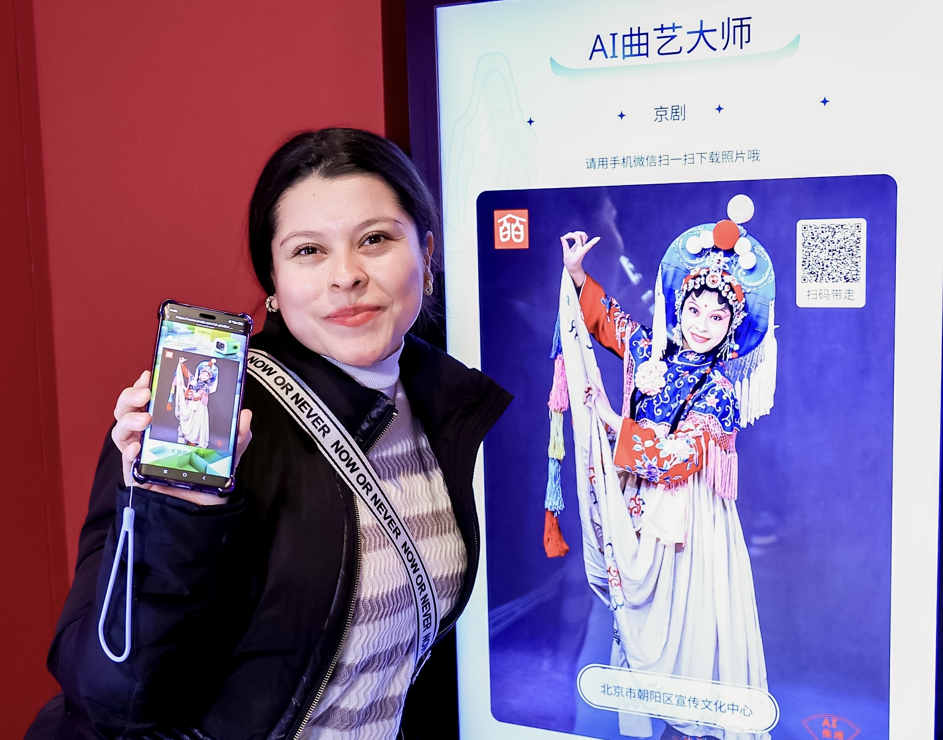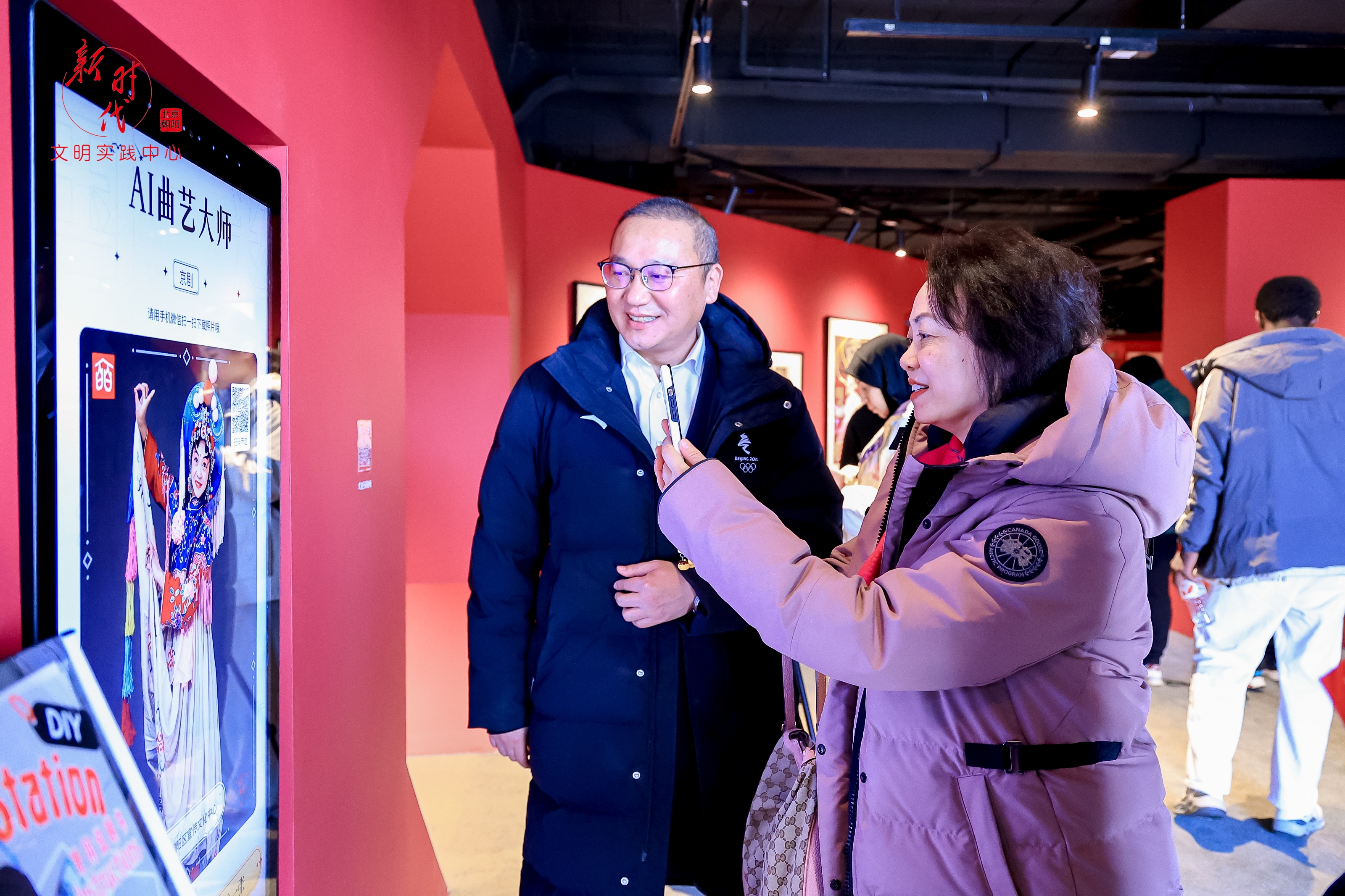 表演结束后,一层图书馆与展厅内的文化体验环节开启。在北京工业大学的外语志愿者陪同下,外国嘉宾穿上戏曲服装,在一桌两椅的经典舞台场景中拍照留念,亲身感受传统戏曲的仪式感;在AI数字交互设备前,中外居民踊跃尝试虚拟换装,科技与传统的碰撞带来了别样乐趣。