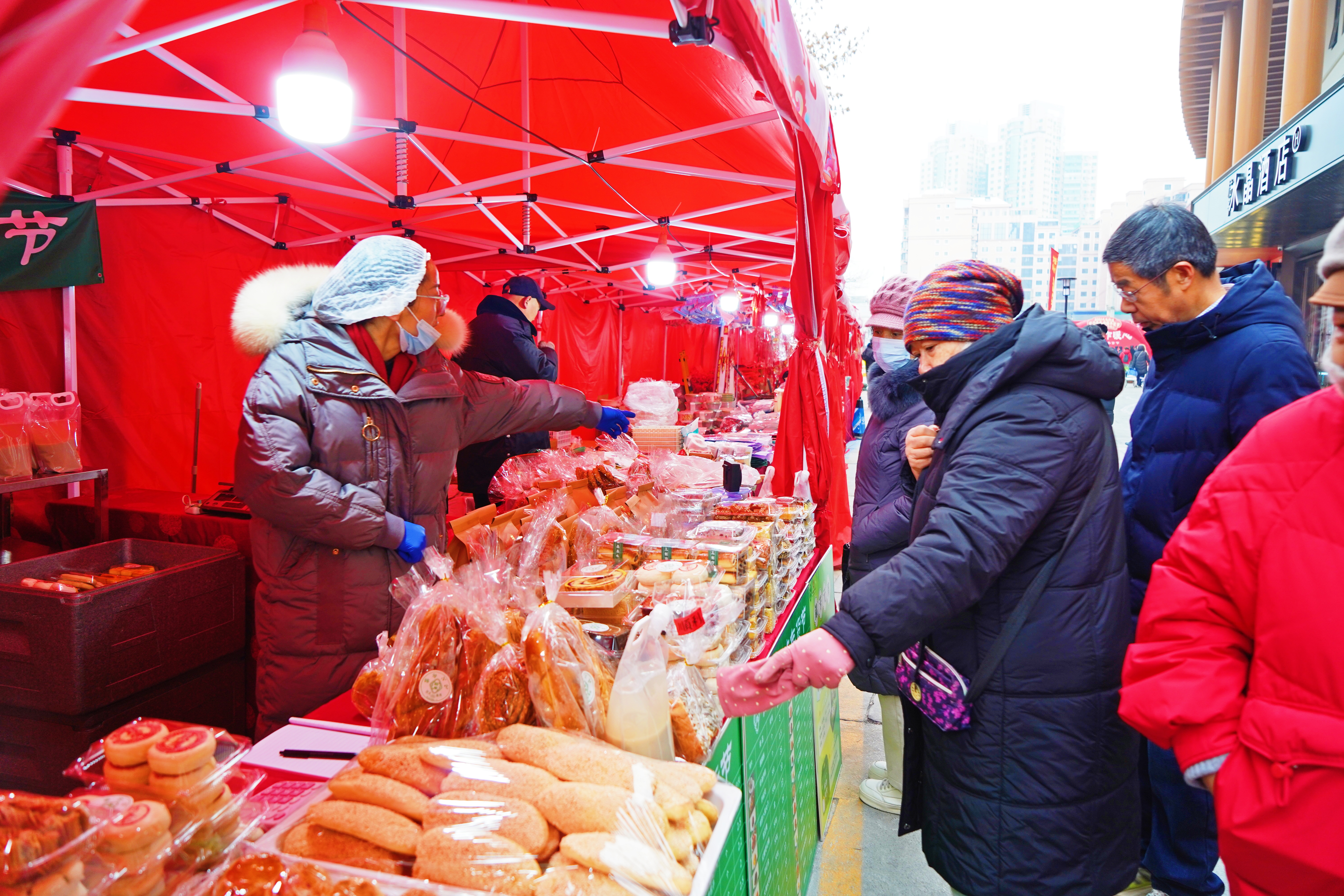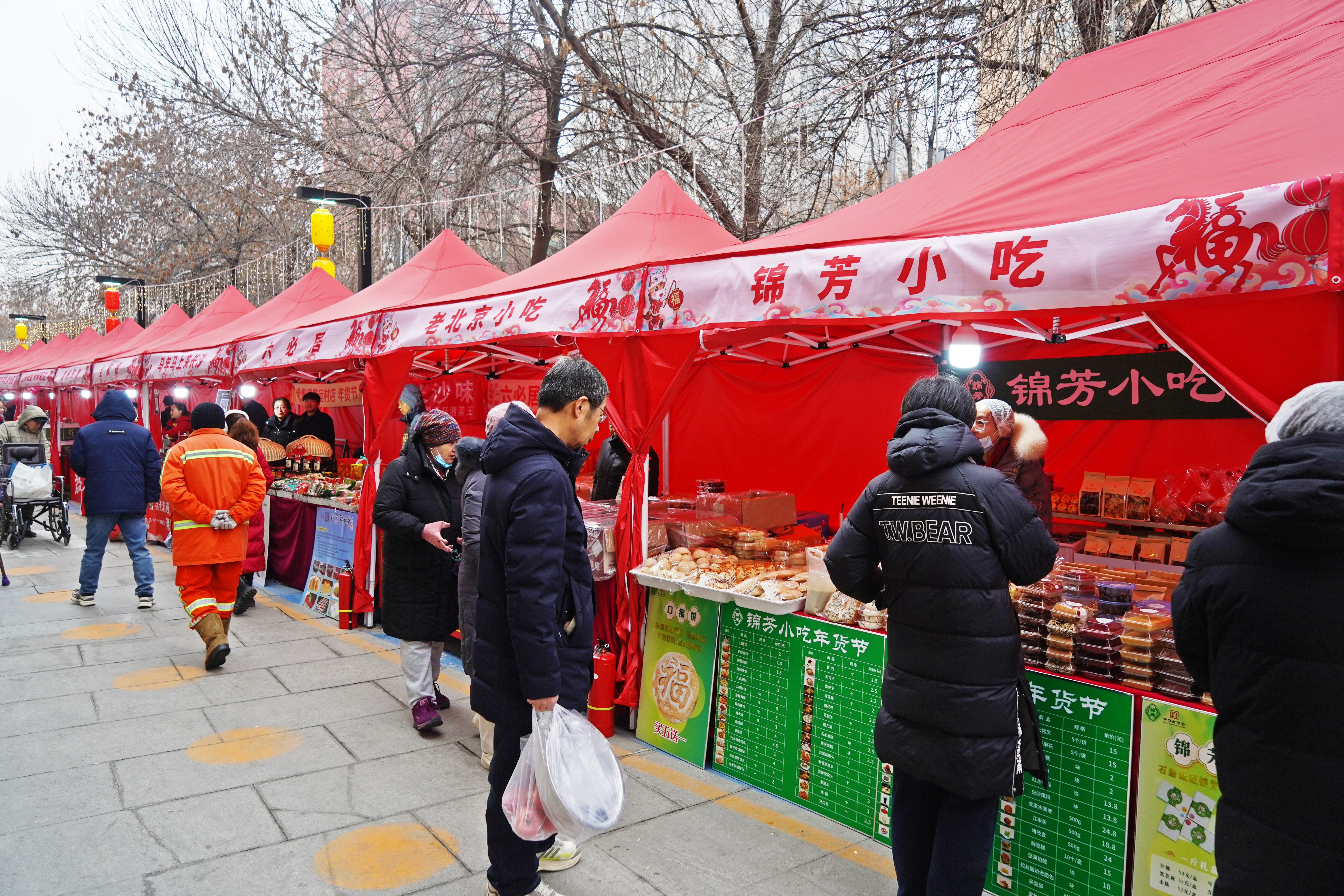 众多老字号也纷纷亮相此次年货节。六必居的酱菜脆爽可口,紫光园的酱牛肉、卤鸡等熟食香气四溢,还有锦芳小吃的口福饼、豆馅饼、糖火烧等应有尽有。前来置办年货的居民在摊位前仔细挑选着各种美食。“在家门口就能买到各地特产和老北京小吃,种类全还方便,提前感受到过年的热闹劲儿了!”居民王大妈说。