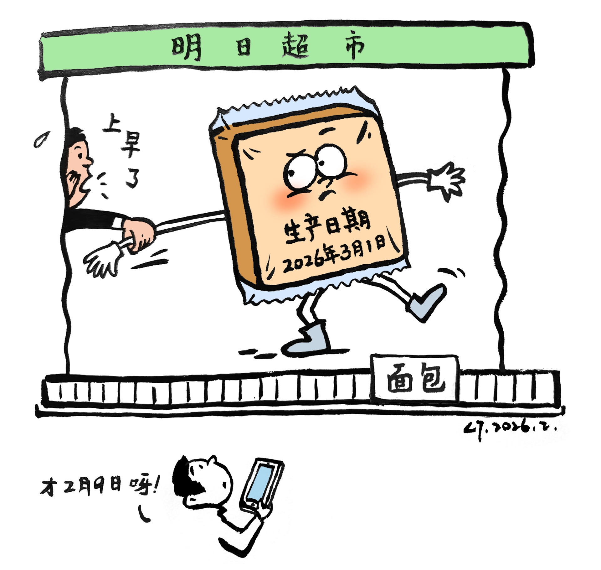 近日,江苏常州一消费者买回面包,发现包装上生产日期为2026年3月1日。商家解释是日期打印错误,经与消费者协商,已给予赔偿。即便是无心之失,往往也会失去消费者信任。日期是产品质量一部分,岂可“早产”。