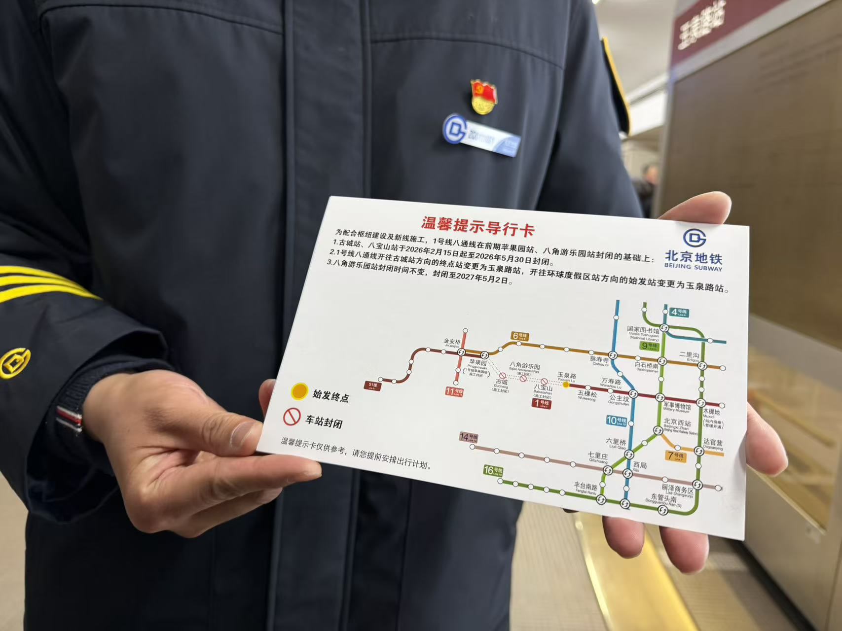 今天上午,记者在1号线八通线沿线车站看到,车站标识、LED显示屏、电子地图等已完成了信息更新,加上1号线八通线之前封闭的车站,共有苹果园、古城、八角游乐园、八宝山等4座施工封闭的车站。“我们已完成了沿线32座车站的信息更新,制作发放导行卡片,通过站车广播播报临时运营信息,早晚高峰增派人员在闸机、站台等关键部位值守,确保指引清晰。”北京地铁运营二分公司苹果园站区站区长梁军表示。