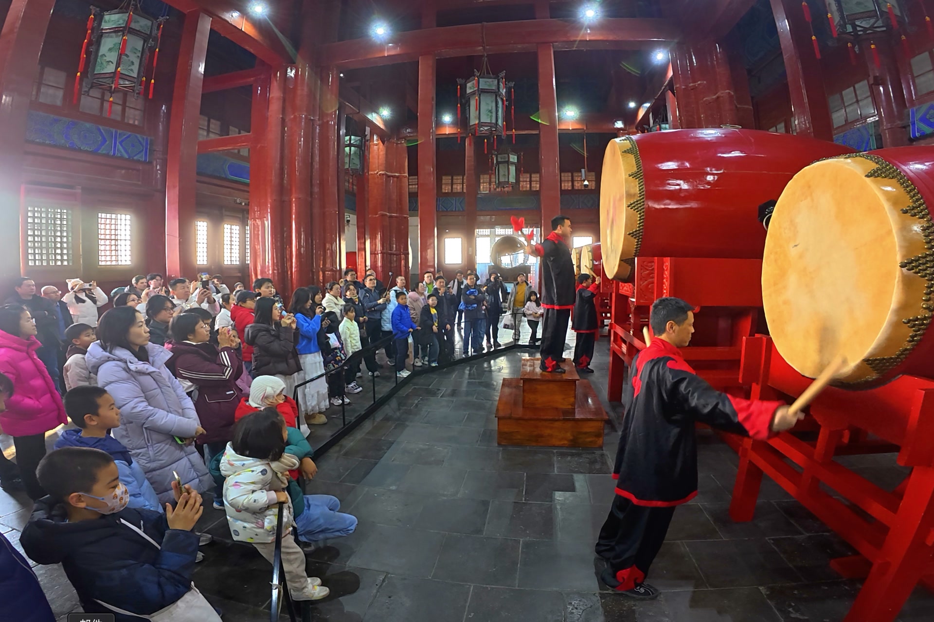 “咚咚咚——”循着鼓声拾级而上,鼓楼二层已是人头攒动。上午10时,全天第一场击鼓表演正式开始。鼓手挥槌敲响大鼓,气势恢宏。“原来这就是‘北京时间’!”隆隆鼓声引得游客连连赞叹,用相机、全程记录表演。北京钟鼓楼是元、明、清三代都城的报时中心,700余年来,由此奏响的暮鼓晨钟,曾回荡在古都上空,是北京城的生活背景音,镌刻出古人的时间秩序。正月初一至初七,鼓楼每天都有6场击鼓表演,来自五湖四海的游人齐聚这座古老建筑,跟随激昂的鼓点一起迎接春来的讯息,共同感受着岁月的流转。