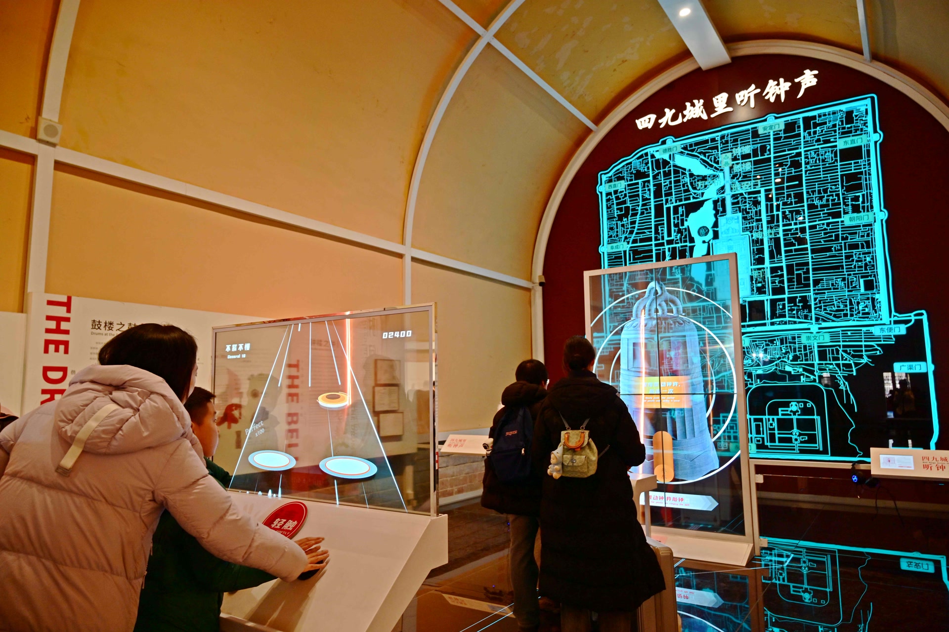 鼓楼一层“时间的故事”展厅里,丰富的互动装置格外受欢迎。“以前只在书上见过永乐大钟,今天亲手‘敲响’它,钟声特别有穿透力。”来自河南的游客王佳雪兴奋地说,还拉着同伴反复体验不同节奏的鼓点。在虚拟的“报时更鼓”“永乐大钟”前体验击鼓、撞钟的报时逻辑,通过触摸屏揭开日晷、铜刻漏等计时仪器的原理,戴上VR(虚拟现实)眼镜开启明清北京中轴线奇幻漫游……古老建筑与数字创意相结合,焕发着全新活力。