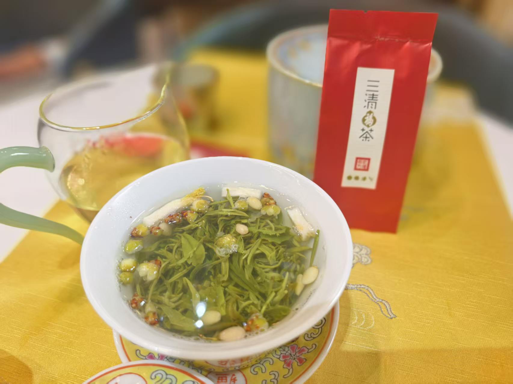 寻味之余,可在见心斋内寻得一份难得的闲适与雅致。这处幽静的江南水景庭院里,游客可以品尝以松实、梅花、佛手烹煮而成的“三清茶”。一家人围炉煮茶,在氤氲茶香与欢声笑语中,感受传统佳节里的温馨与惬意。移步至院内的正凝堂,这里正在举办年宵花展,各色花卉争奇斗艳。