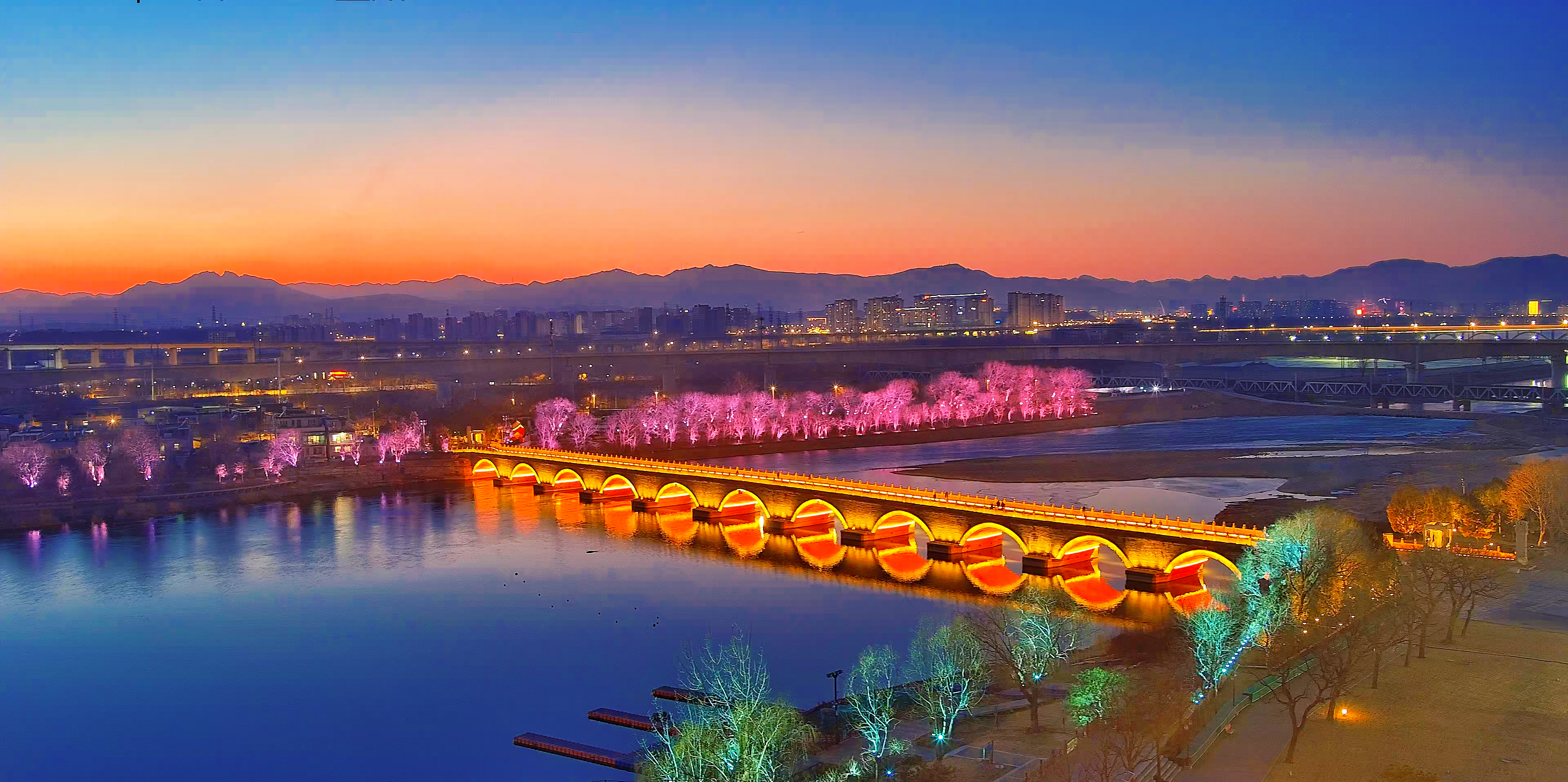 夜色中,宛平城城墙上,数千套景观照明灯准时亮起,暖黄色的灯光勾勒出古城轮廓,城楼、垛口轮廓分明。城西,卢沟桥上的石狮在柔和灯光映衬下更显沧桑,桥洞的橘黄色灯光,宛若“金光穿洞”,异常绚丽,永定河滨水步道上,变色灯光沿河岸蜿蜒,如梦如幻。城内,中国人民抗日战争纪念馆的轮廓光带与城墙灯光遥相呼应,庄重肃穆。