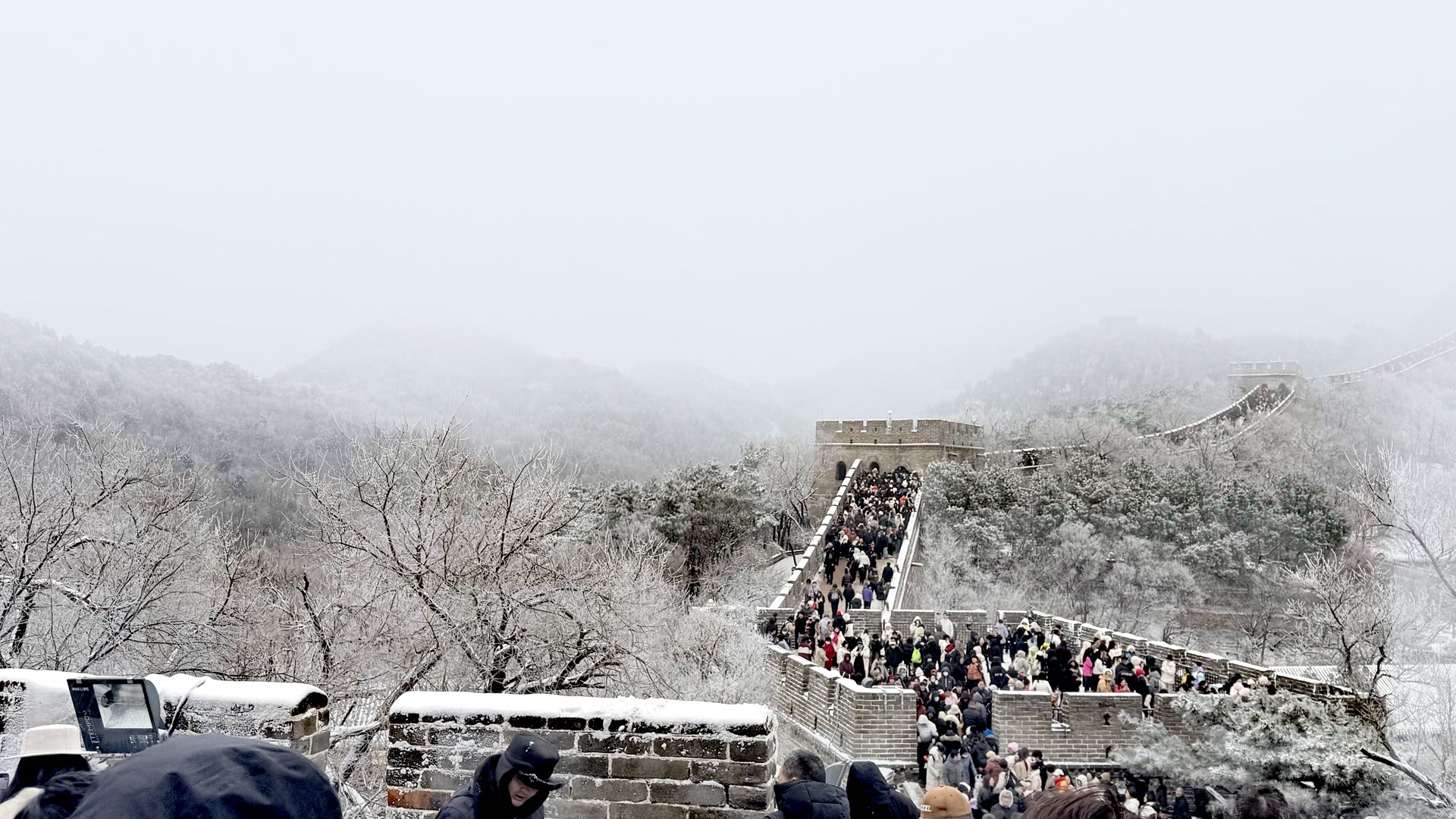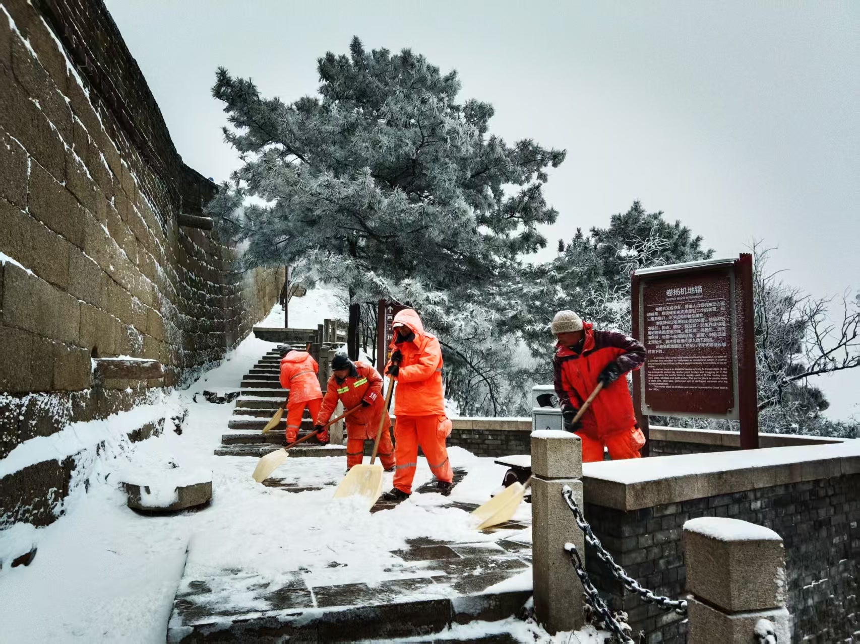 面对降雪天气,八达岭景区迅速启动应急预案,在城上各点位布置了防滑沙袋,在陡坡路段设置了安全扶绳,保洁人员凌晨3时开始除雪,确保游览通道畅通。目前主干道和上城通道已经清理完毕,游客可放心登城。