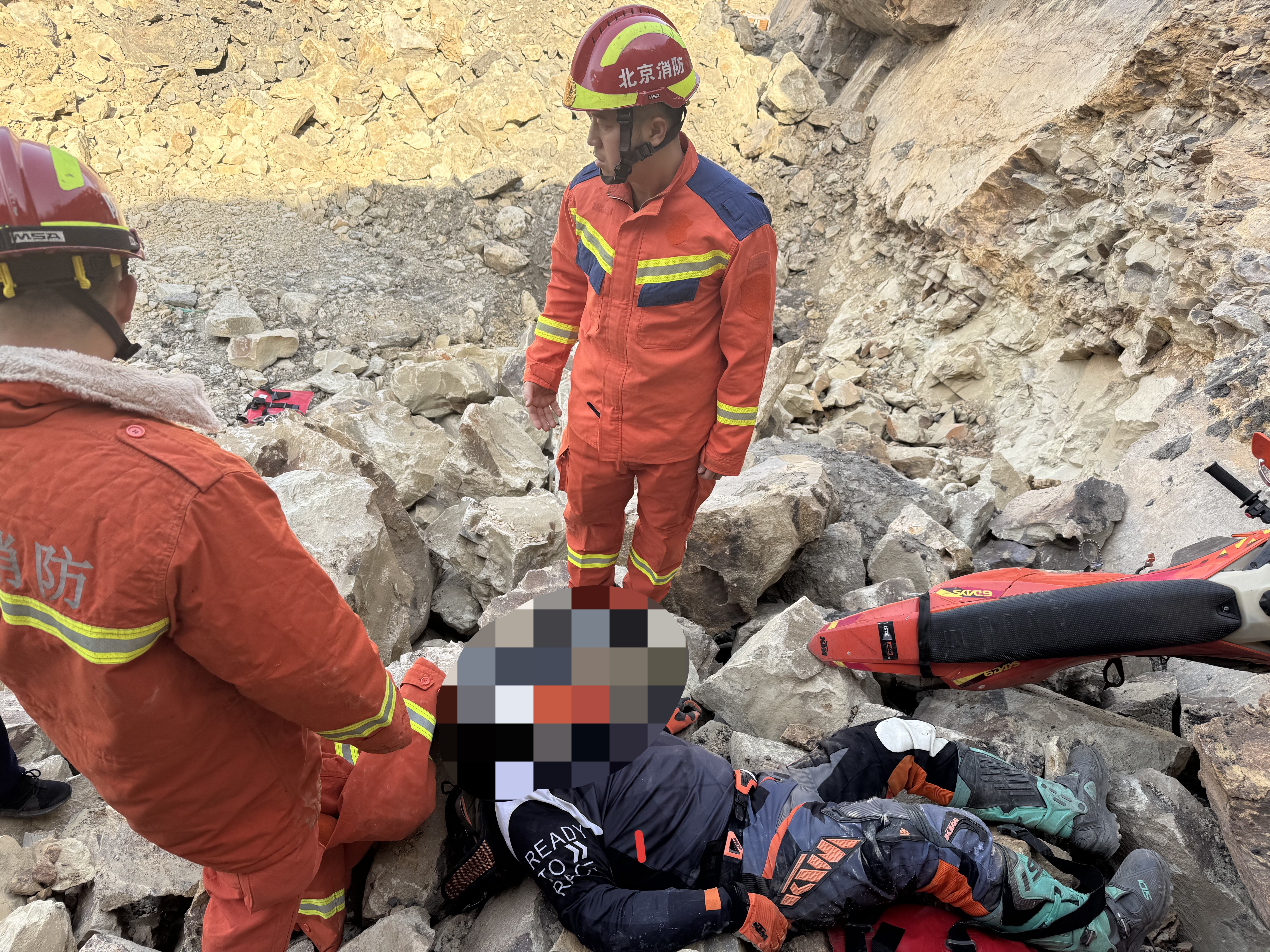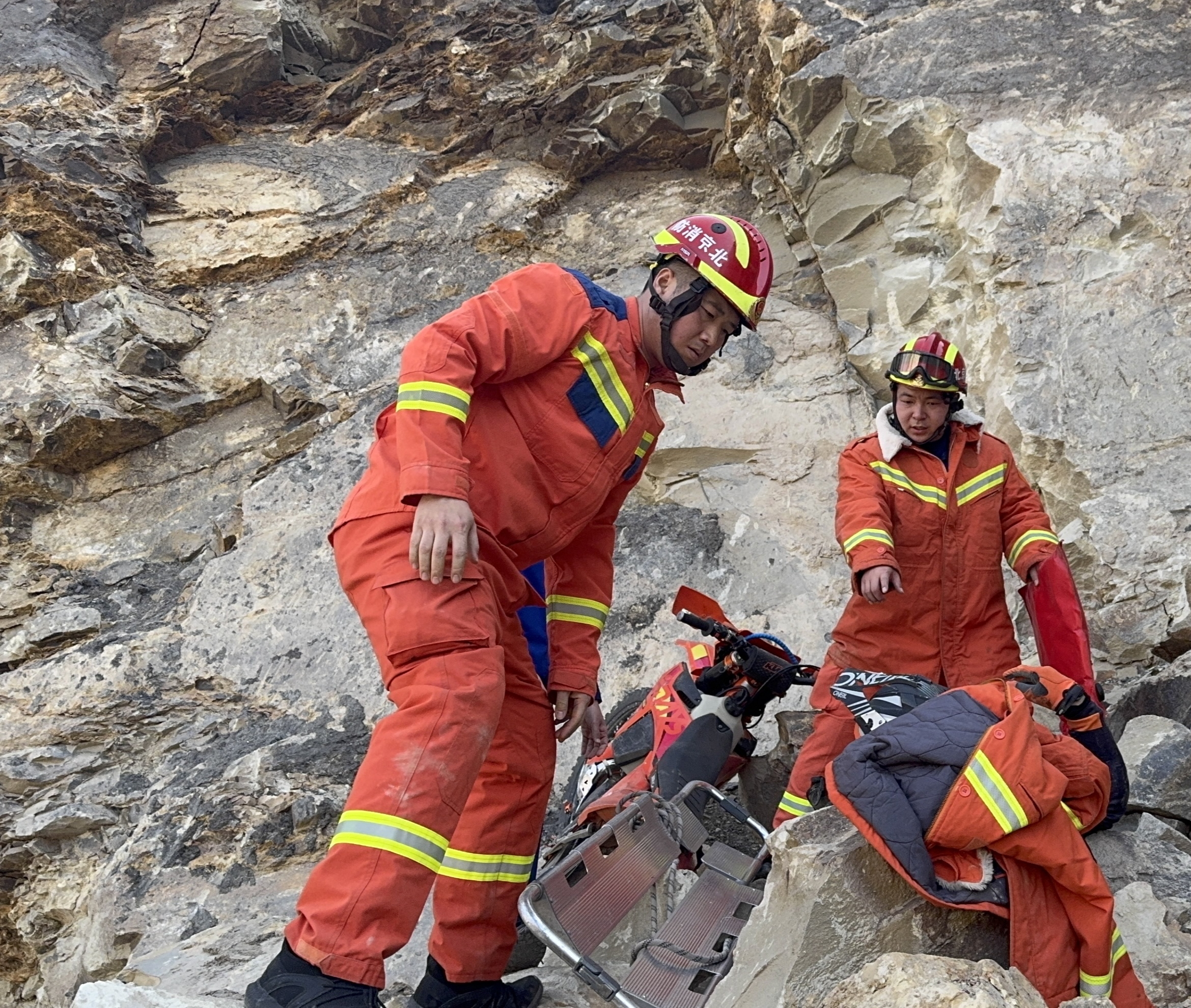 当日11时22分,门头沟区永定消防救援站接到报警称,九龙山有男子骑摩托车跌落悬崖,急需救援。事故地点地形复杂、山势陡峭,救援难度较大,消防救援人员随即携带绳索、担架、破拆工具、生命探测仪等专业救援装备,火速赶赴现场。