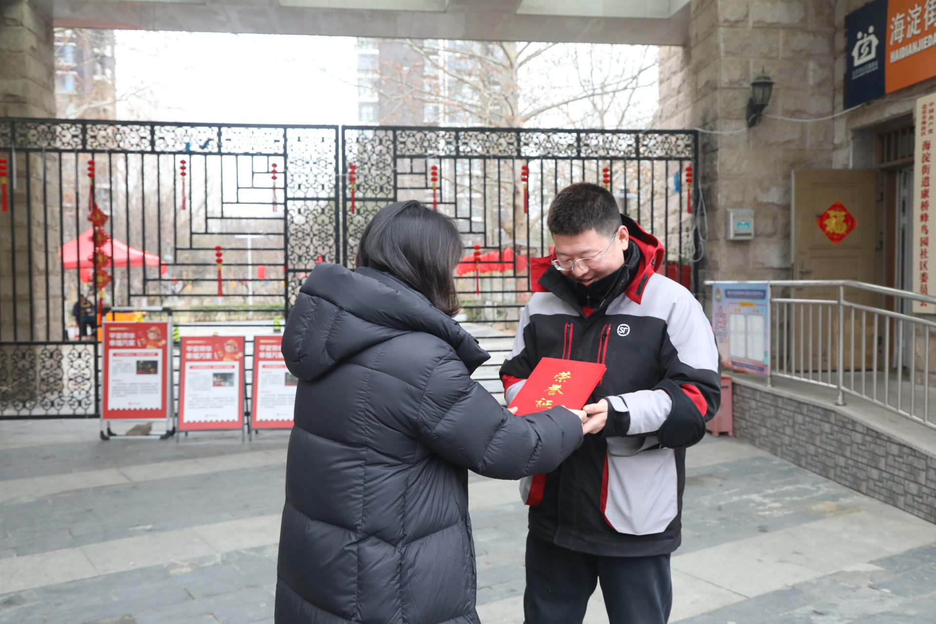 2月28日,海淀区海淀街道康桥蜂鸟园社区服务站,顺丰速运快递小哥陈鸿森接过海淀街道特意送来的感谢信和荣誉证书。春节留京保供期间,他勇擒盗件嫌犯,书写了属于平凡人的正义担当,得到了大家的赞扬。