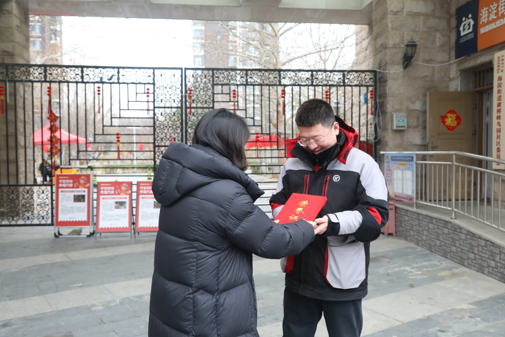 2月28日,海淀区海淀街道康桥蜂鸟园社区服务站,顺丰速运快递小哥陈鸿森接过海淀街道特意送来的感谢信和荣誉证书。春节留京保供期间,他勇擒盗件嫌犯,书写了属于平凡人的正义担当,得到了大家的赞扬。详情>>