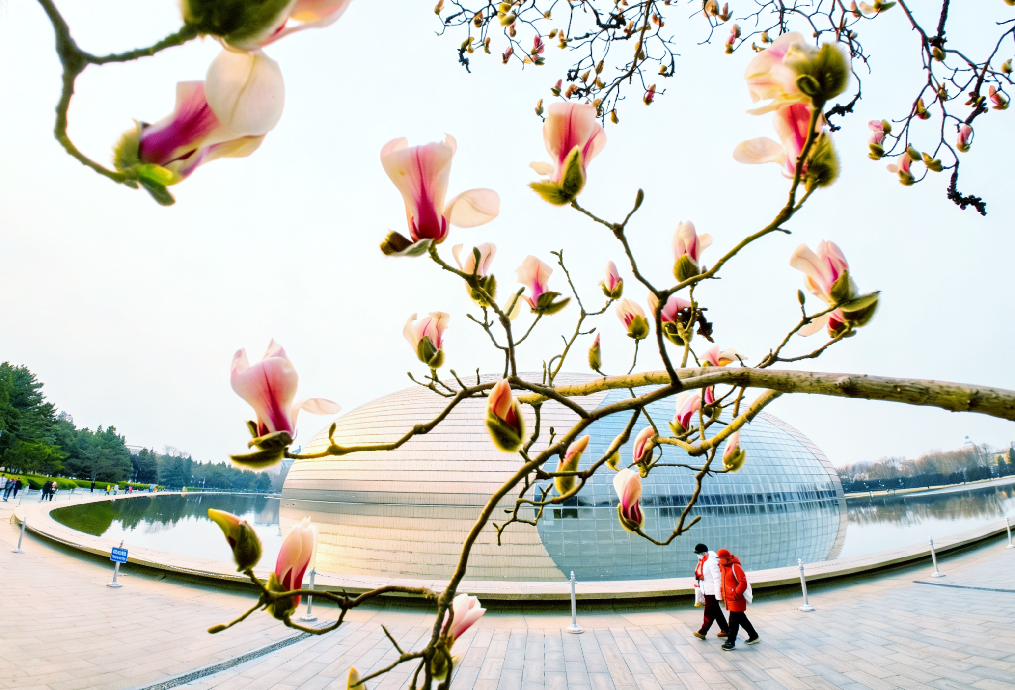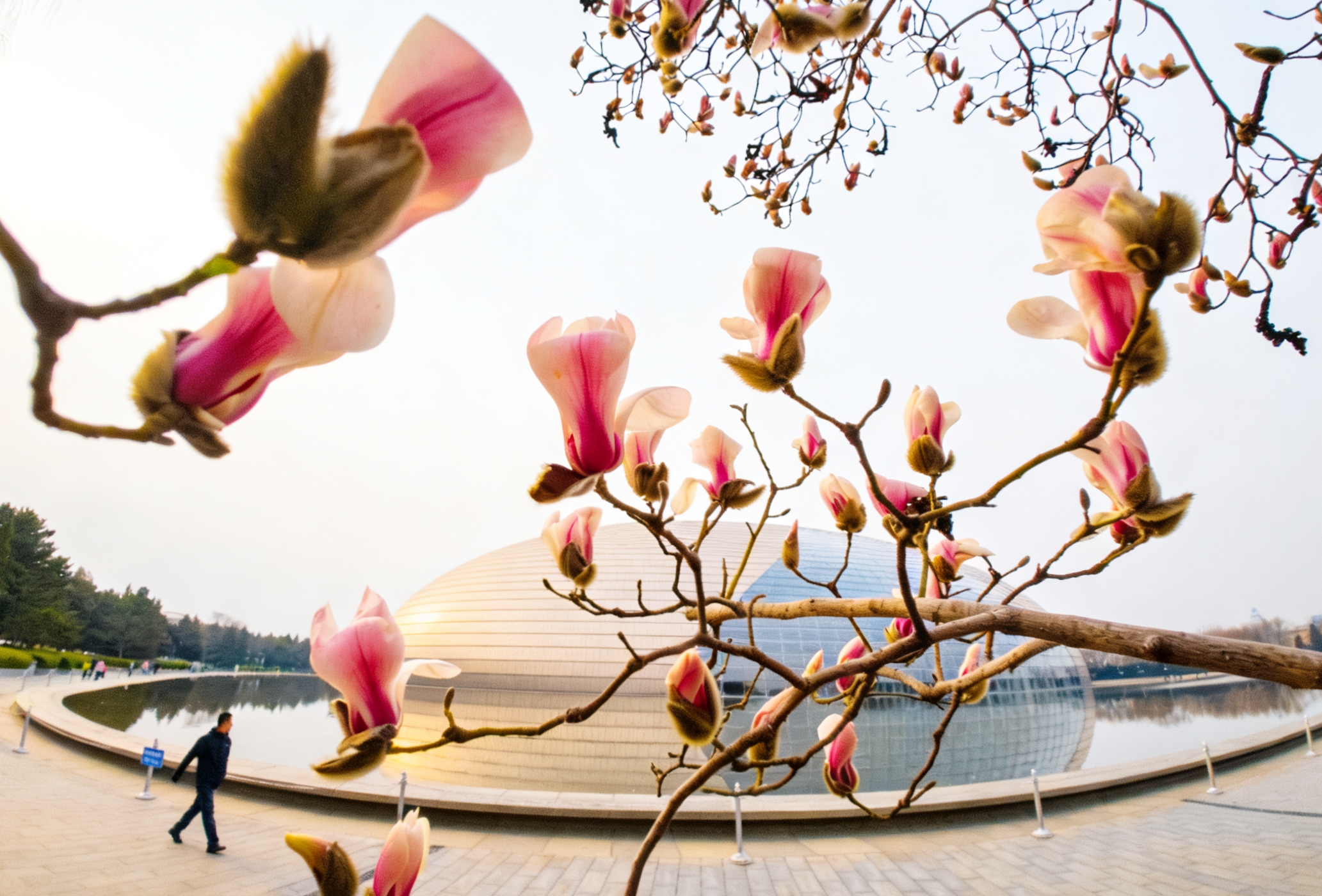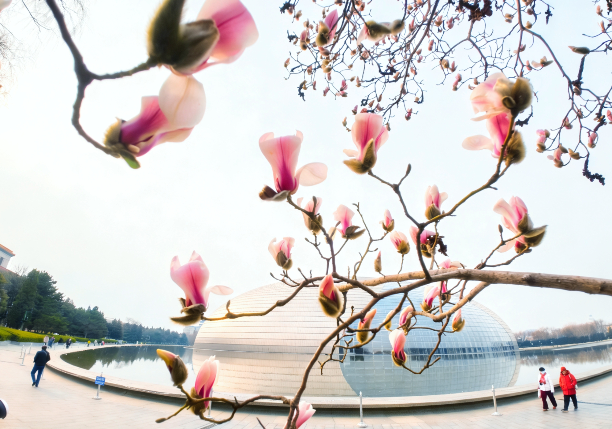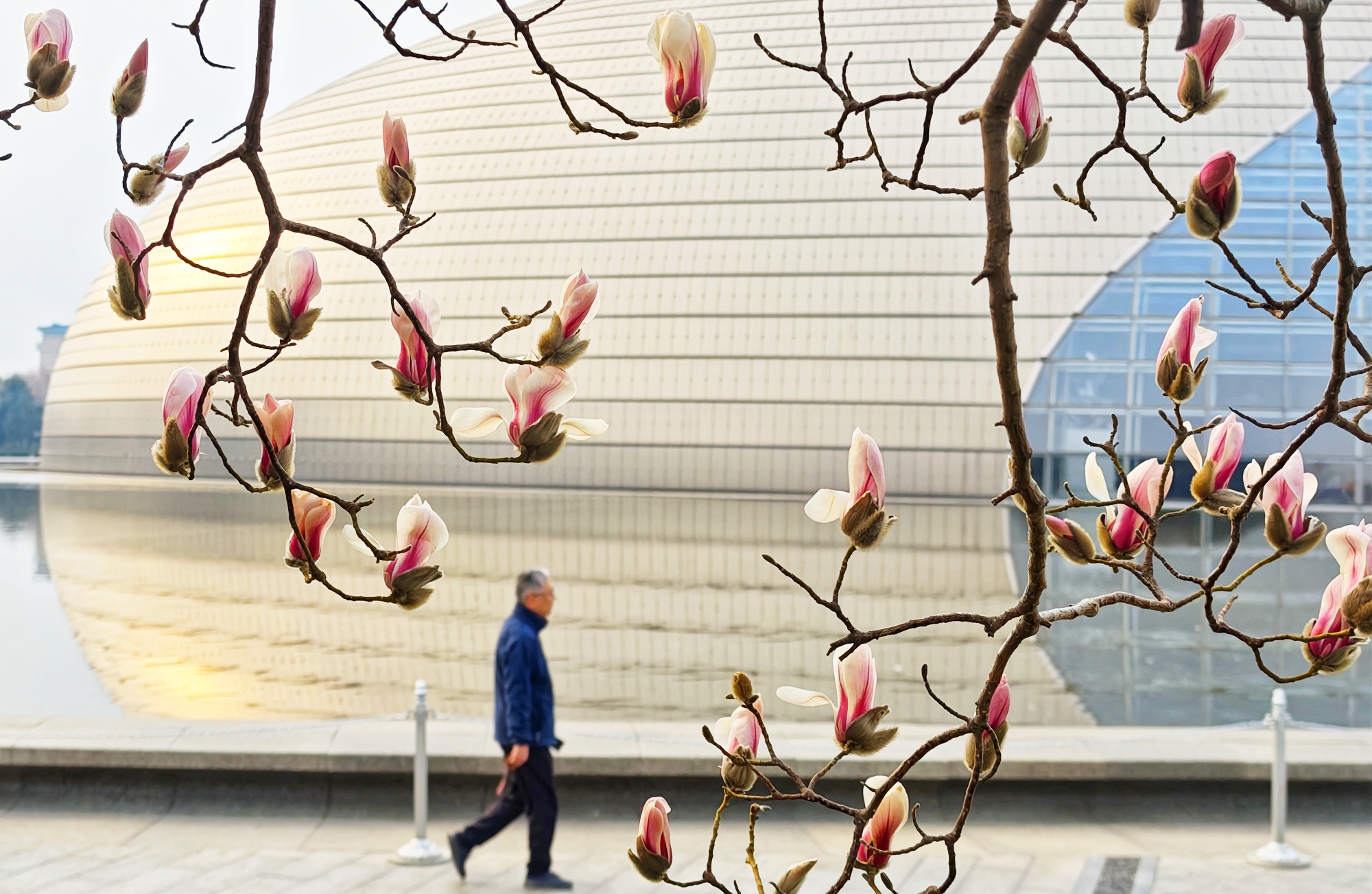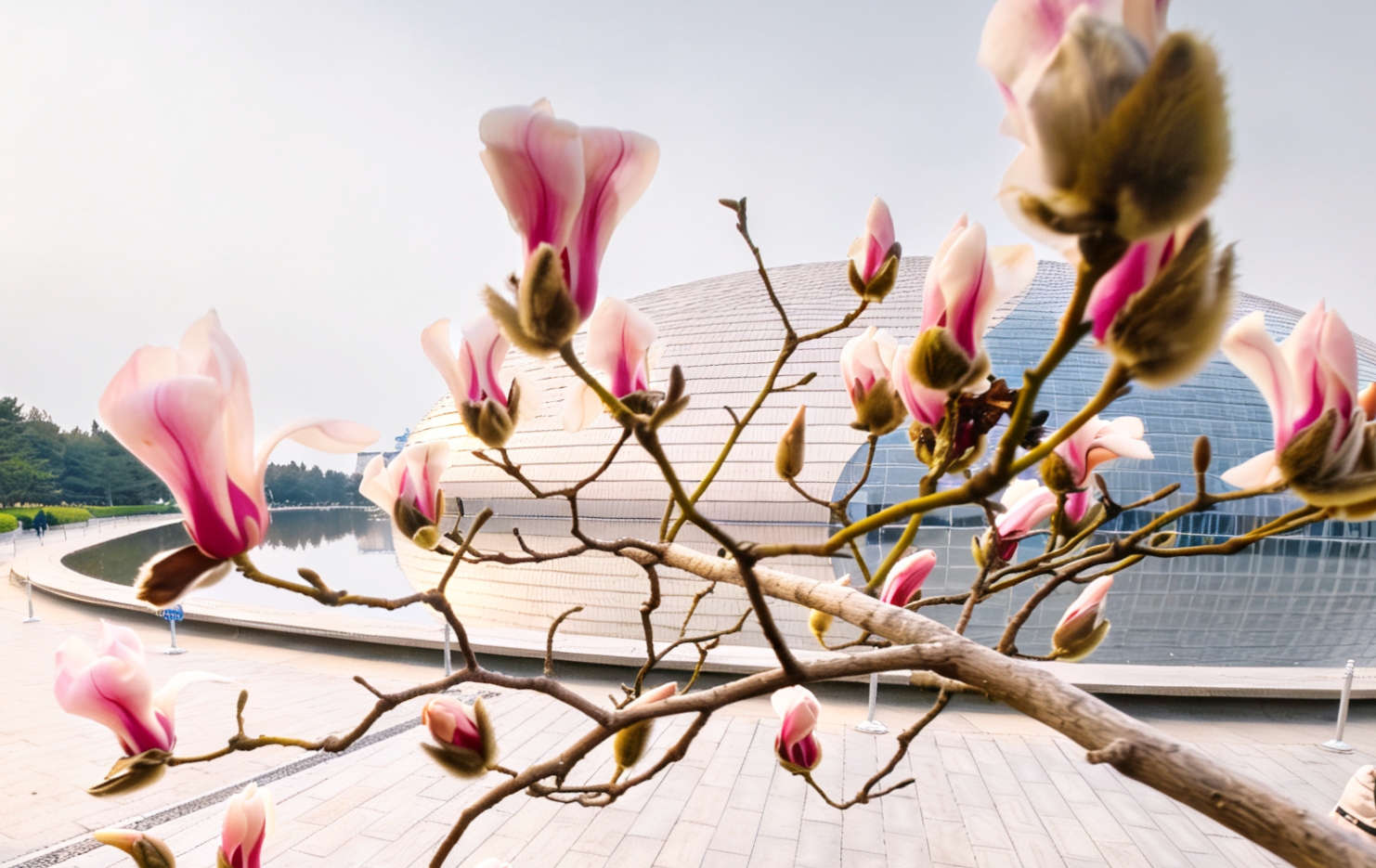 随着春意渐浓,首都处处生机勃发。国家大剧院前,数株玉兰携春风悄然绽放,花瓣轻舒,粉紫与洁白相间,清雅脱俗,为庄严大气的京城增添一抹温婉灵动的盎然春意。