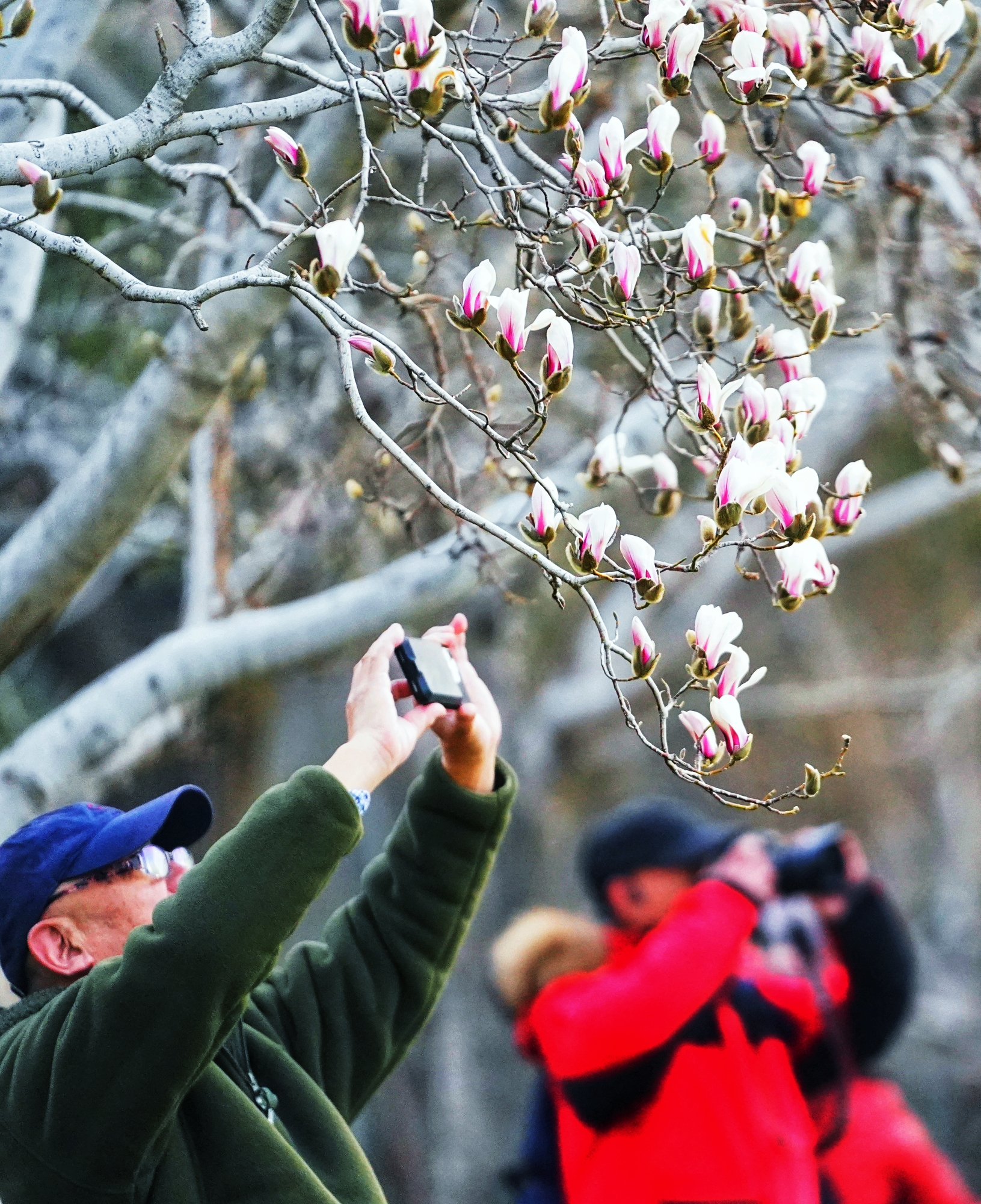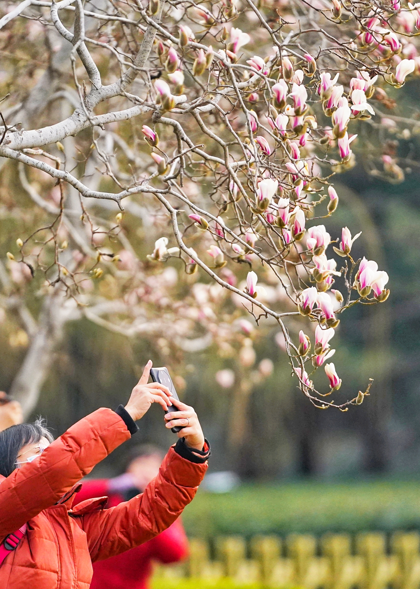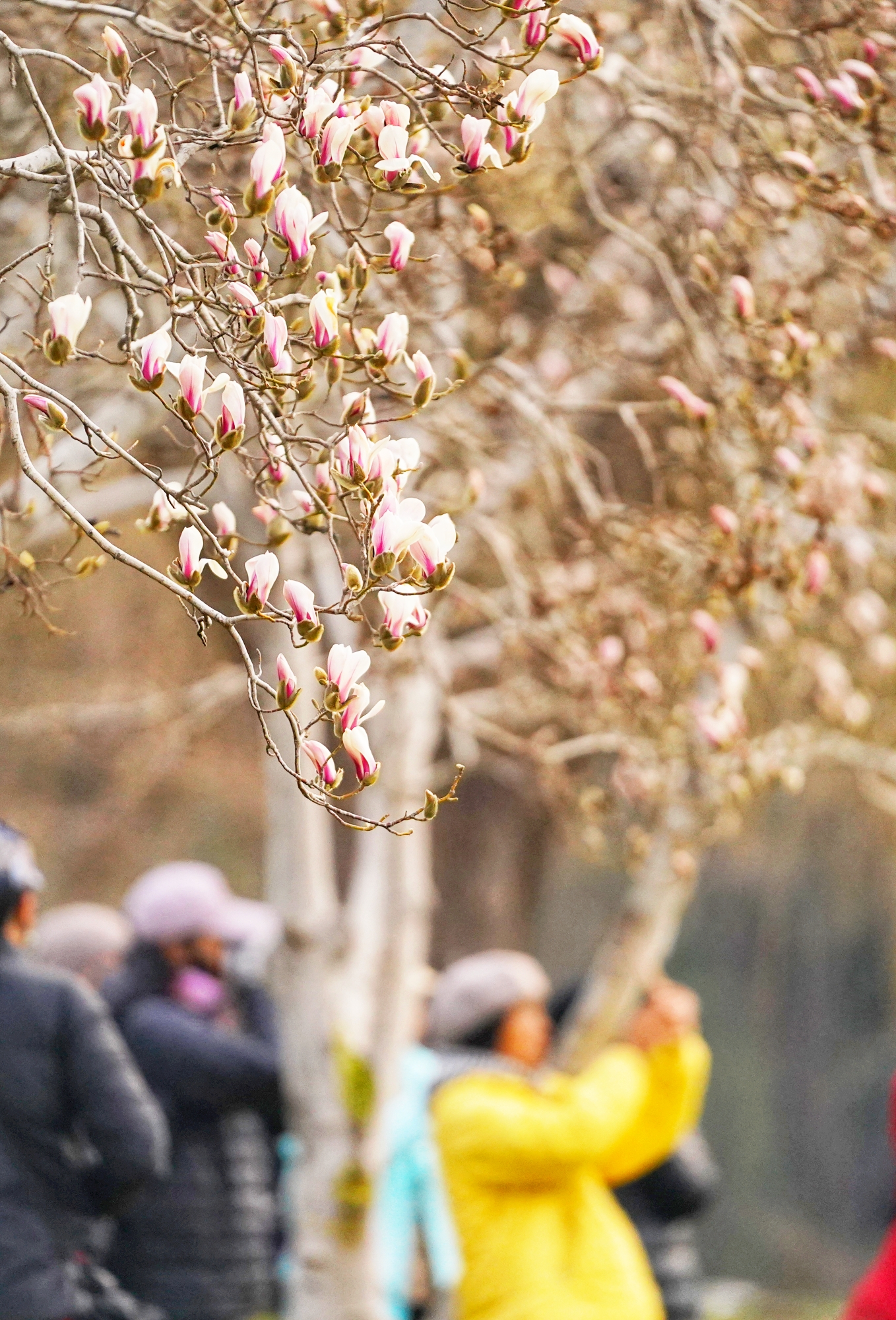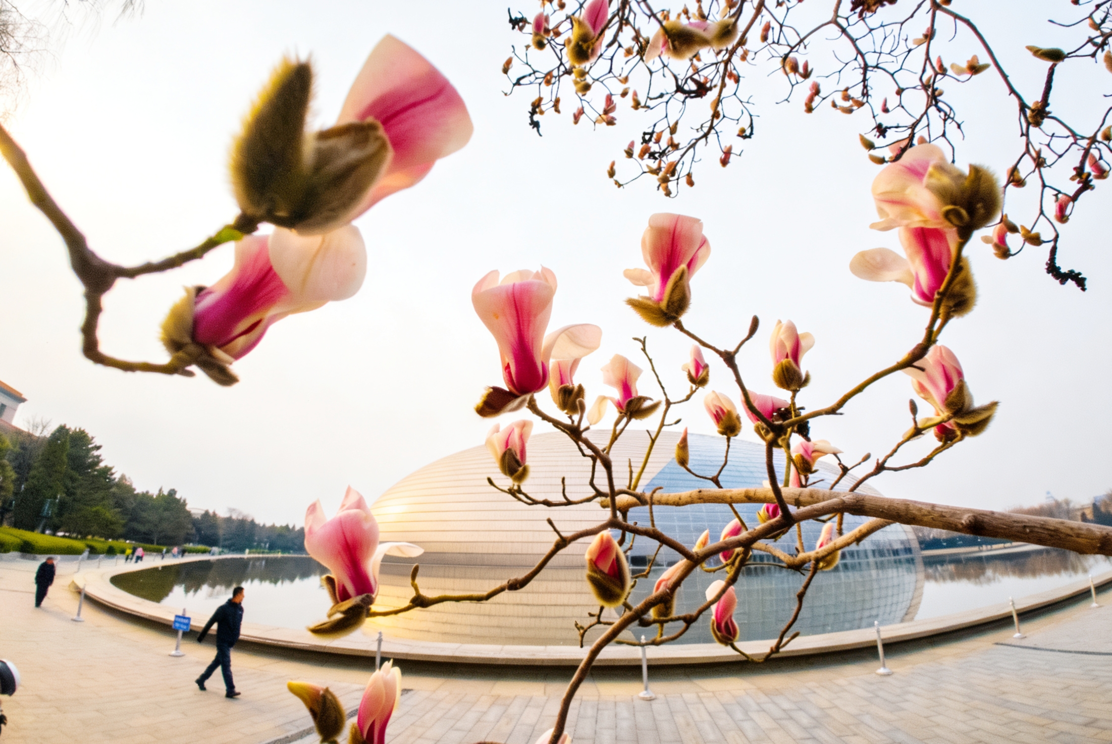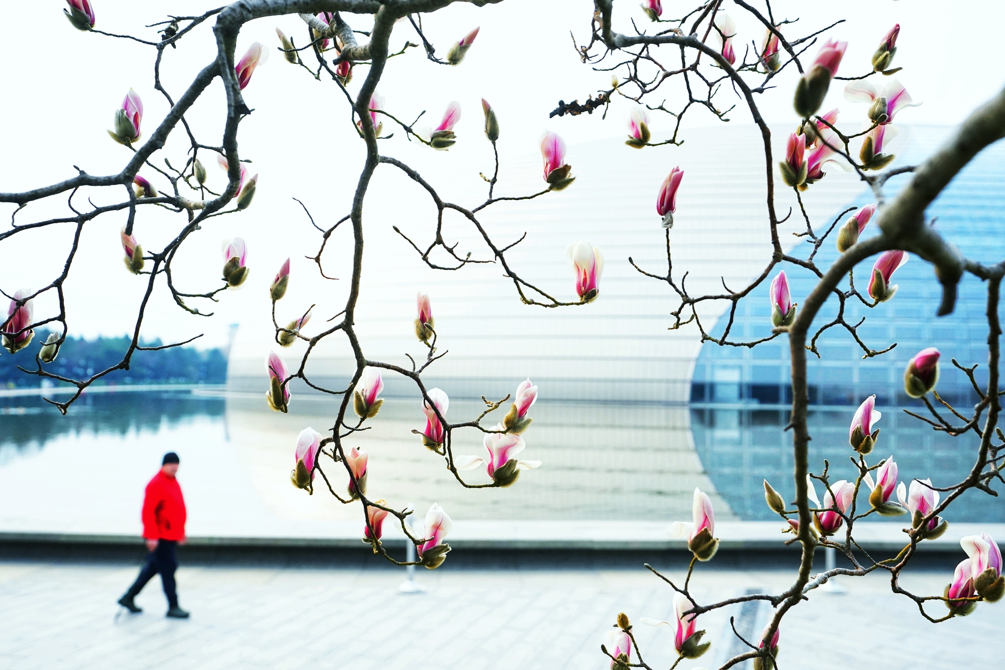 随着春意渐浓,首都处处生机勃发。国家大剧院前,数株玉兰携春风悄然绽放,花瓣轻舒,粉紫与洁白相间,清雅脱俗,为庄严大气的京城增添一抹温婉灵动的盎然春意。