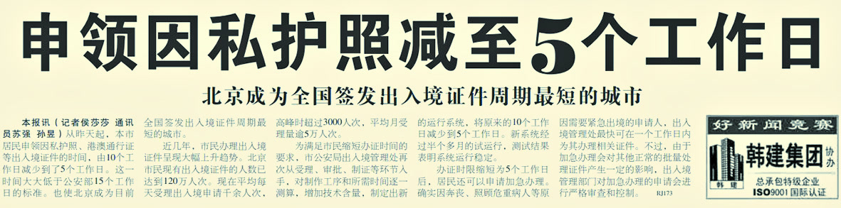 同时,办证时限一缩再缩。为了让市民尽快拿到护照,北京从受理、审批、制证等环节入手,多次对制作工序和所需时间逐一测算,增加技术含量,不断制定新的运行系统,从2003年到2004年,本市居民申领因私护照的时间,由原来的14个工作日缩短到5个工作日。这一时间大大低于公安部15个工作日的标准,也使北京成为当时全国签发出入境证件周期最短的城市。不仅如此,居民确实因奔丧、照顾危重病人等原因需要紧急出境的,还可以申请加急办理。(2004年6月8日《北京日报》5版,《申领因私护照减至5个工作日》)