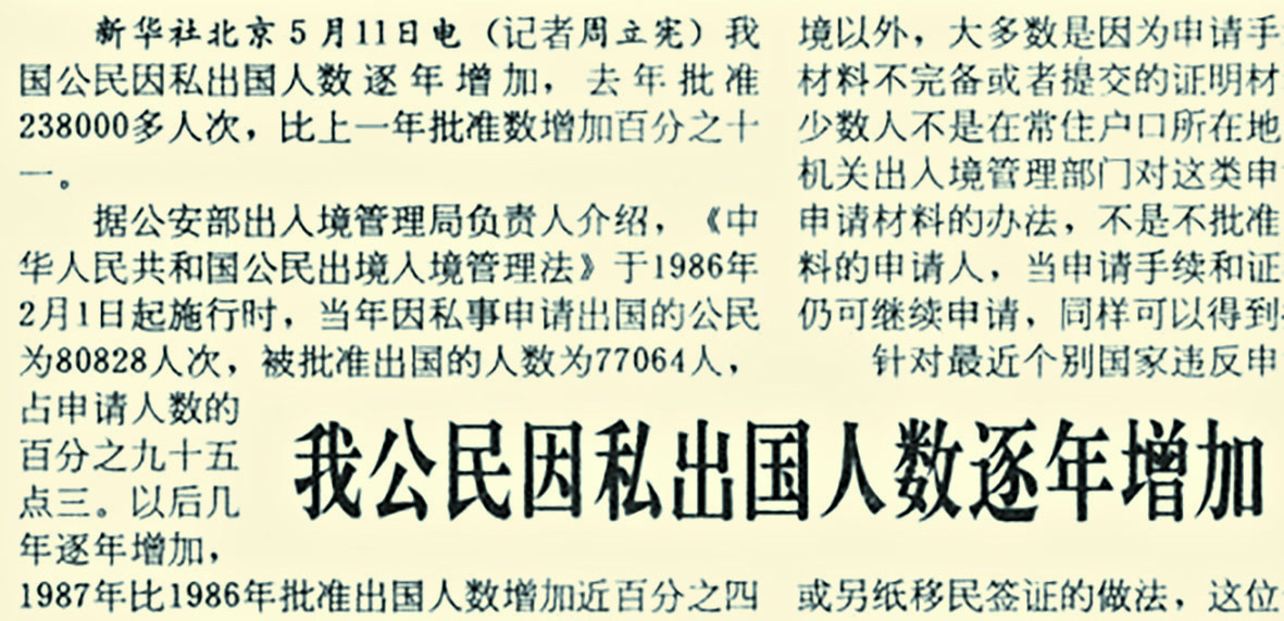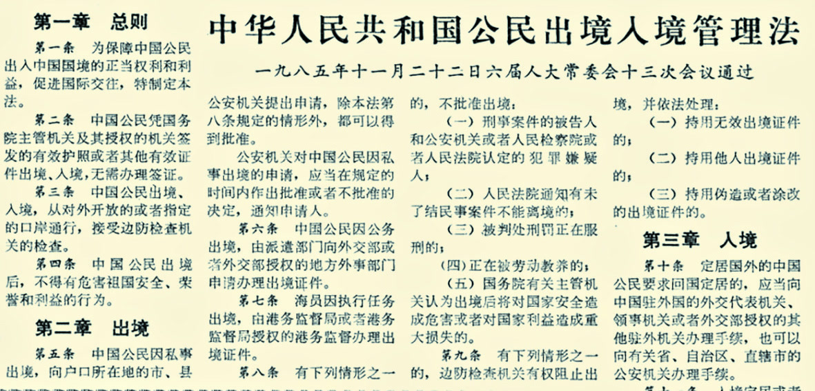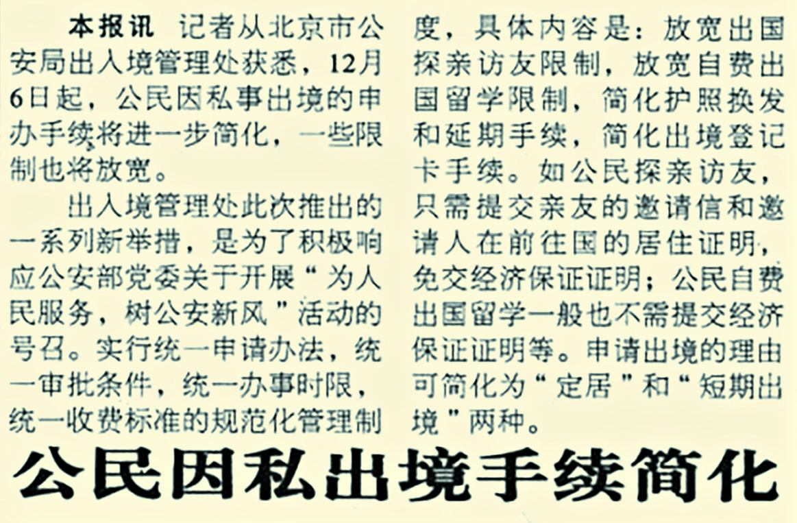 1986年2月1日起,《中华人民共和国公民出境入境管理法》正式施行,首次以法律的形式明确了我国公民因私事(如探亲、旅游、留学、就业等)合法出境入境的权利。对于普通市民来说,出国方便了许多。(1985年11月23日《北京日报》4版,《中华人民共和国公民出境入境管理法》)