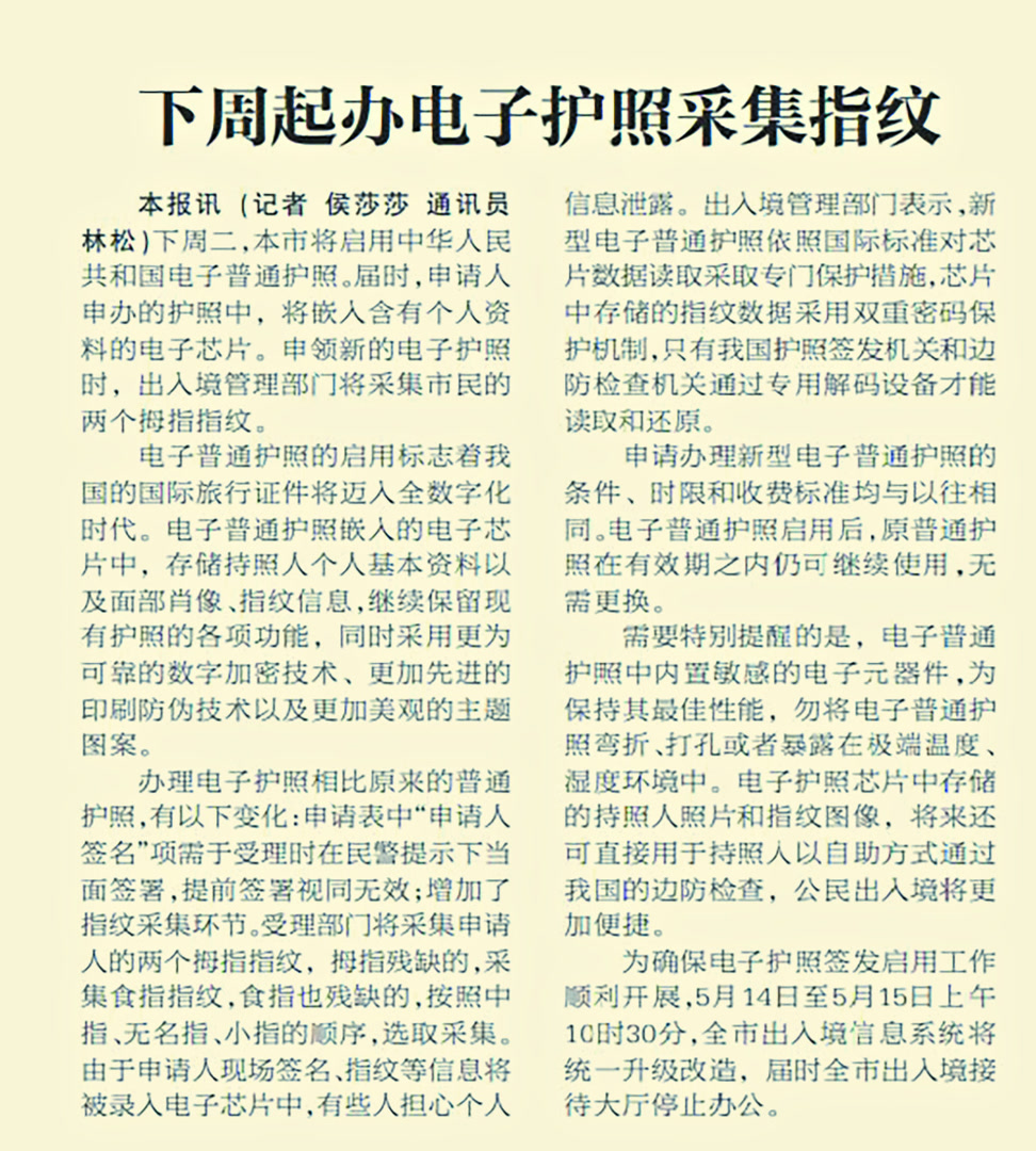 出境需求的持续增长,对护照的安全性提出了更高要求。从上世纪90年代开始,我国护照陆续开始技术升级。2000年7月,北京开始向因私出国者颁发新版(97版)护照,这也是新中国成立以来启用的第12版因私普通护照版本。其内页采用固定长城水印图案专用纸,在资料页里取消了“身份”“婚姻状况”等内容。不仅如此,新版护照的制作技术及防伪性能都已接近国际一流水平。签发护照时,包括持证人照片在内的个人资料一次打印完成,取代了原有贴照片塑封的做法,可有效防止揭换照片伪造或变造护照。同时,在原有国际标准机读码的基础上,护照内增加了中文机读码,有利于持证人出入境接受检查时快速通关。(2000年5月27日《北京日报》5版,《新版护照7月发》)