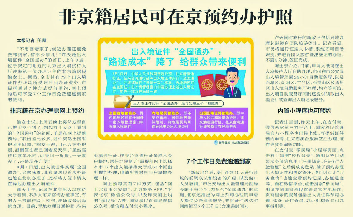2019年,北京全面落实普通护照全国通办政策,无论户籍地在哪儿都能在京办理护照,手续与户籍地一致。非京籍居民可以就近选择,再不用返乡办护照了。(2019年4月2日《北京日报》6版,《非京籍居民可在京预约办护照》)