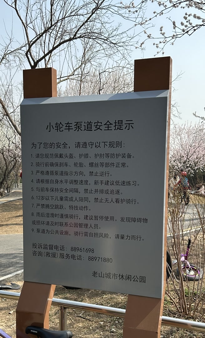 周六上午10时许,老山城市休闲公园“悦骑山林”附近的免费泵道上已十分热闹,二三十个孩子骑着平衡车、小轮车在场地内穿梭,这里既有两三岁的低龄儿童,也有中学生。记者注意到,泵道入口处立有“安全提示牌”,上面明确写着:“规范佩戴头盔、护膝、护肘等防护装备”“严格遵循泵道指示方向,禁止逆行”“与前车保持安全间隔,禁止并排或追逐”等安全规则。